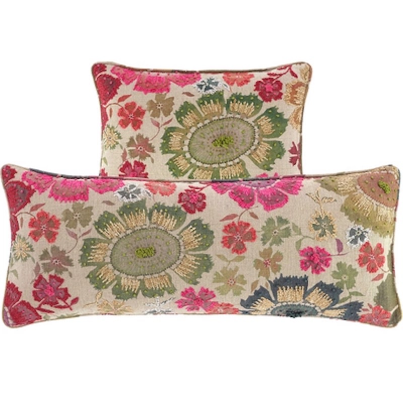 Pine Cone Hill's Peruvian Floral Embroidered Multi Decorative Pillow has stunning blooms printed in natural.  Then vegetal tones of Cerise, Juniper, Coral, Leaf, Ice, and Juniper are hand embroidered in French knot accents, using space dyed boucle yarns to create a floral bouquet of sumptuous proportions.  A gorgeously embellished rustic linen accent pillow, perfect for brightening any room.  Single side embroidery pattern. Knife edge. Zipper closure.  100% linen.