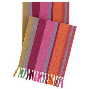 Pine Cone Hill's Pilar Stripe Throw is soft cotton twill weave that will add a touch of cozy elegance. Bring pops of color with sizzling stripes of Burnt Orange, Cerise, Cereulean Blue, Turquoise and Chartreuse to any bed or chair. The perfect companion for fireside reading or snuggling-up on the deck and watching the sun go down. The hand loomed twill weave throws are crafted with comfort in mind. 100% Cotton with 5" fringe on length ends.