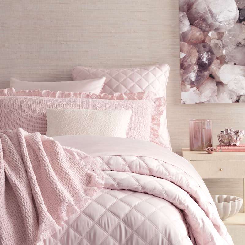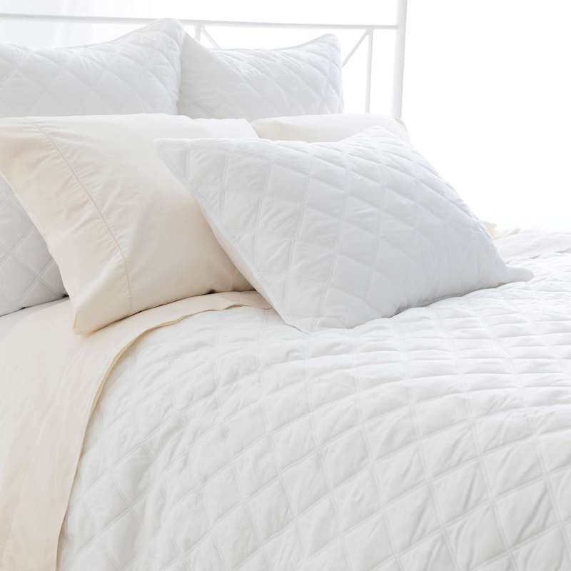 Pine Cone Hill's Quilted Silken Solid Coverlets and Shams are quilted for dramatic texture and lightweight for all year round comfort. 400 thread count sateen weave TENCEL® Silken Solid bedding has a clean and modern aesthetic. 2 1/2 double stitch diamond pattern." 1" hem with rounded corner finishing. Double sided.