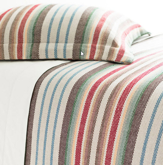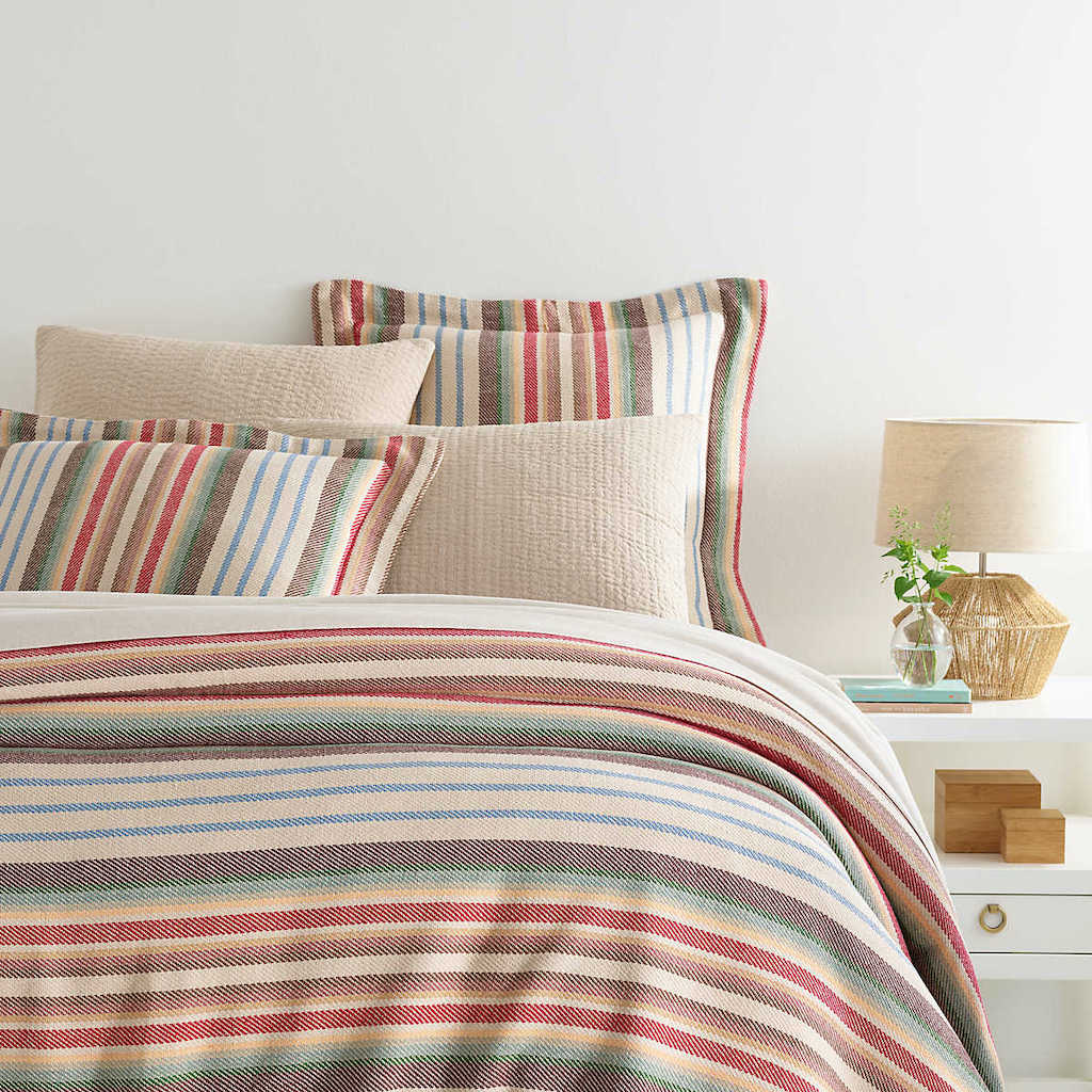 Pine Cone Hill's Ranch Blanket and Shams are textured with vivid colored graphic horizontal stripes all on one durable, yarn-dyed woven cotton blanket and shams. Colors that can be seen are cream, red, brown, blue, green and yellow. Shams have tieback closure with 2 1/2" flange. 100% cotton. Machine wash cold, tumble dry low. Do not bleach.