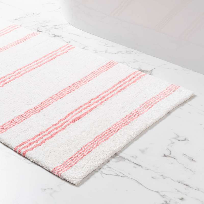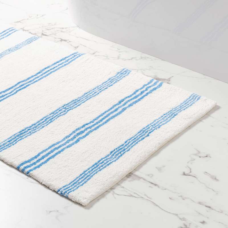 Pine Cone Hill's Rowe Stripe is an elegant and understated ticking stripes on a white ground are inspired by our classic Swedish Stripe flat woven cotton rug. "A better pick-me-up than that morning cup of joe: Step out of the shower and be greeted by one of our favorite stripes!" Available in Coral, French Blue or Shale on White ground. Densely tufted for cloud-like softness underfoot from a densely plush and substantial long-staple cotton. 100% Cotton