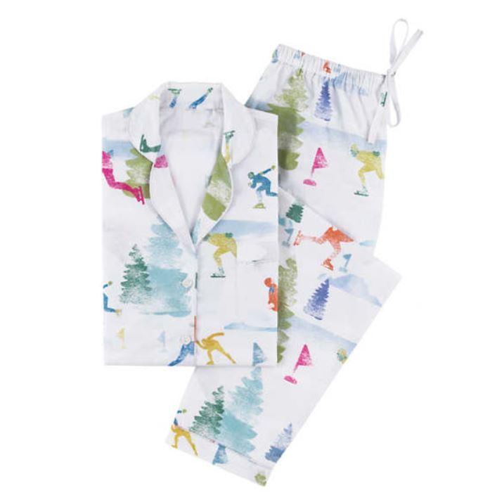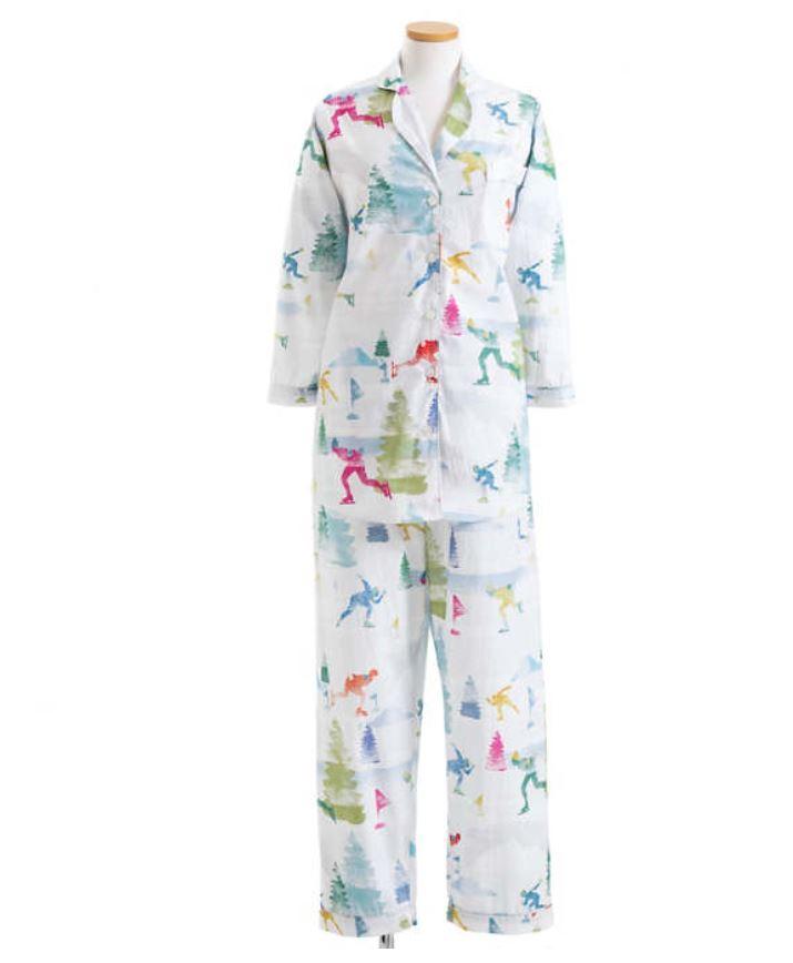 Pine Cone Hill's Skaters Pajamas' design is fun and bright.  This delightful winter scene makes for a lyrical bed time story on our duvet cover and matching sham.  Multicolored speed skaters are twirling and spinning around the icy pond, surrounded by groups of conifers, delighting and inviting you to sleep. Digitally printed on crisp, pure cotton percale for superior reproduction.  These pajamas are cut a little longer and trimmed to skim the body and accentuate the feminine, featuring a notched collar and shirttail curved back. The pants have an elastic waist with tie for comfort.