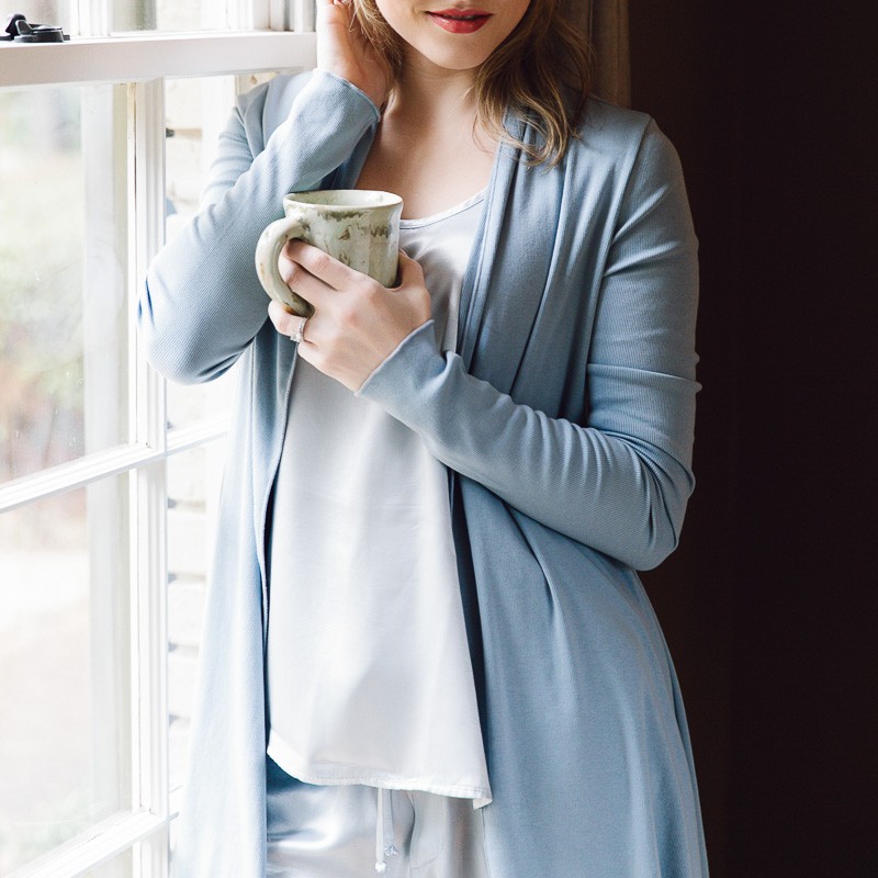 buttery soft cotton-lycra 2x1 rib. Washes well and retains its shape. Simple flattering cut. I throw this on every morning as I run around the house. Some Sundays I don't even get out of my PJ Harlows. Blair wears hers to work!