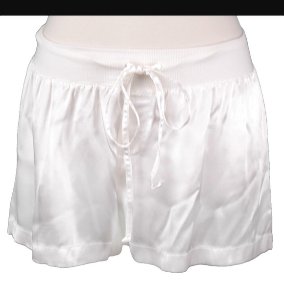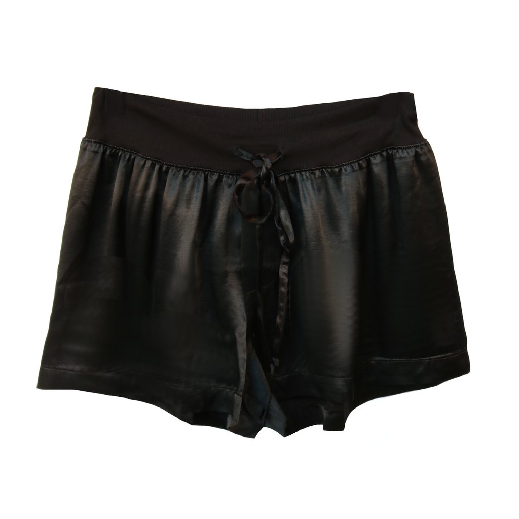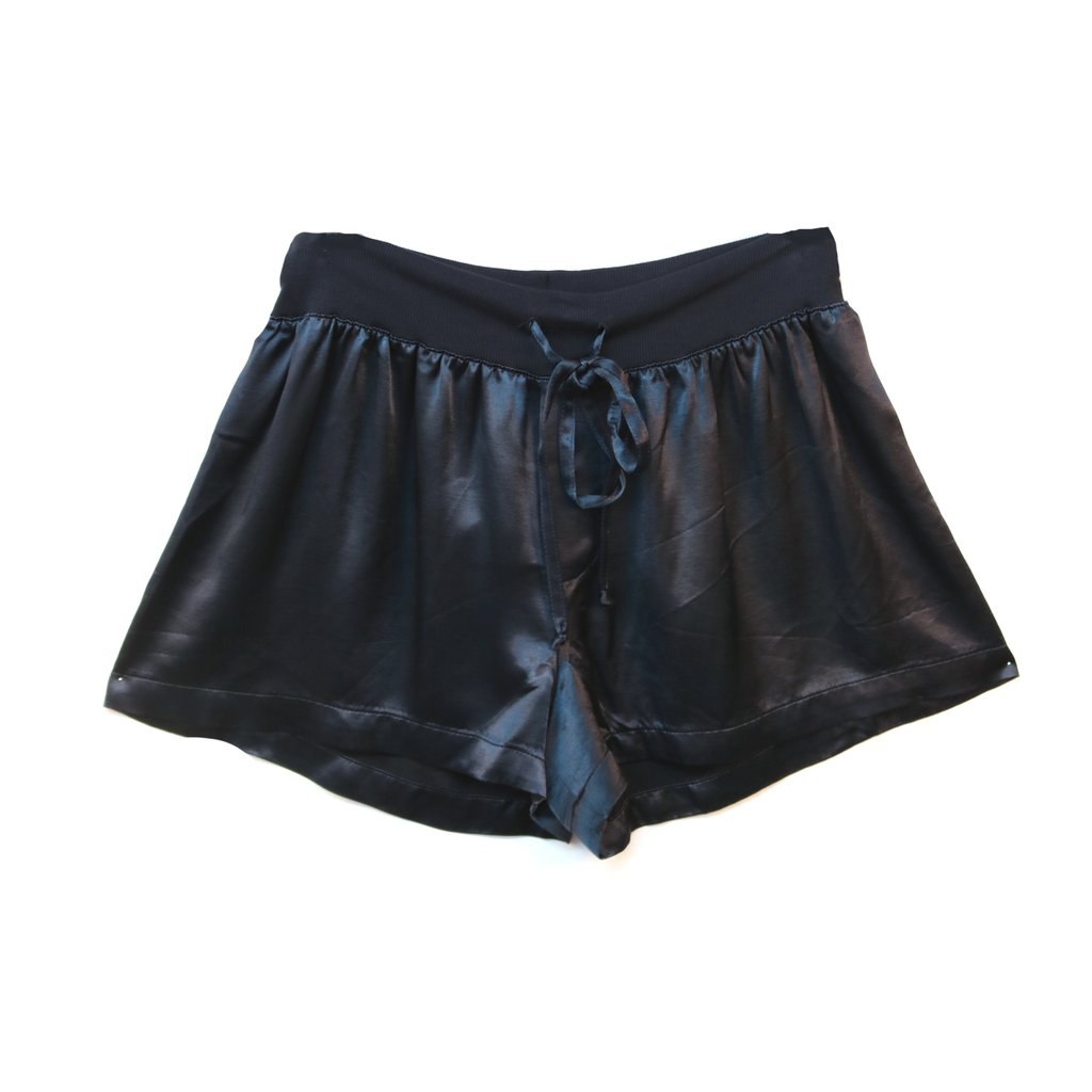 A satiny boxer short perfect for lounging and sleep. Has a lightweight ribbed waistband with a tie closure. Drops below waist.