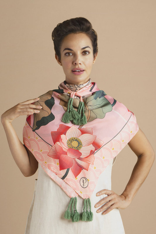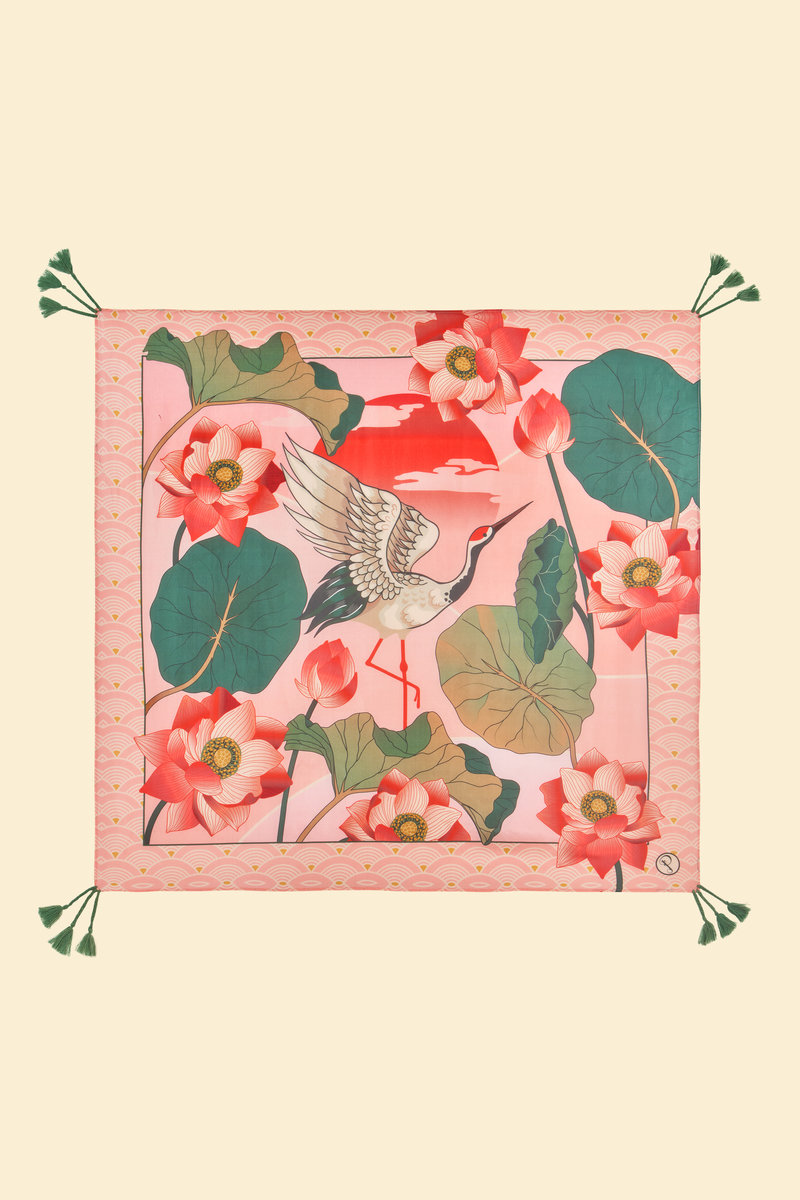 Powder Design's Tasseled Silk Crane at Sunrise in Petal Scarf channels all things wild and free! Art deco inspired borders and decorative florals combine with our iconic crane to create the most extravagant design yet! This scarf is tasseled for an extra tier of luxury. Comes with a bespoke and limited-edition complimentary gift box to make for a perfect gift or treating yourself! 100% silk.