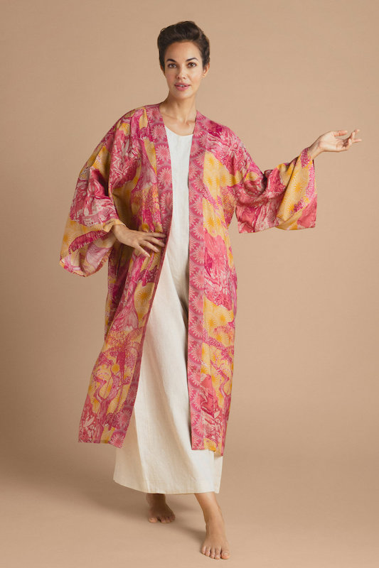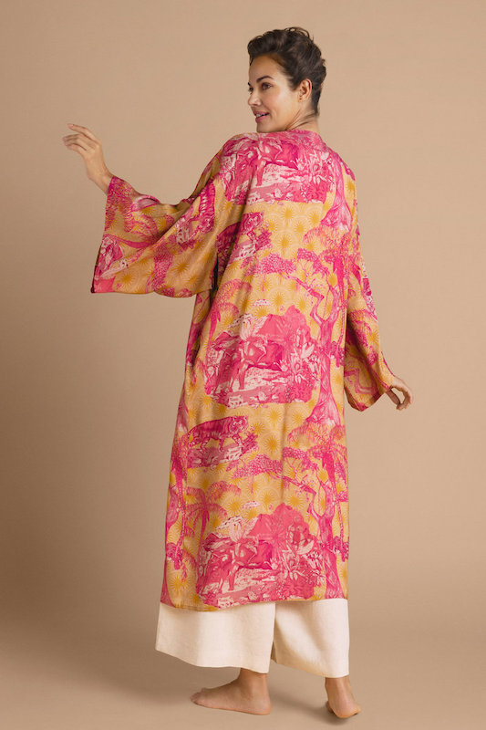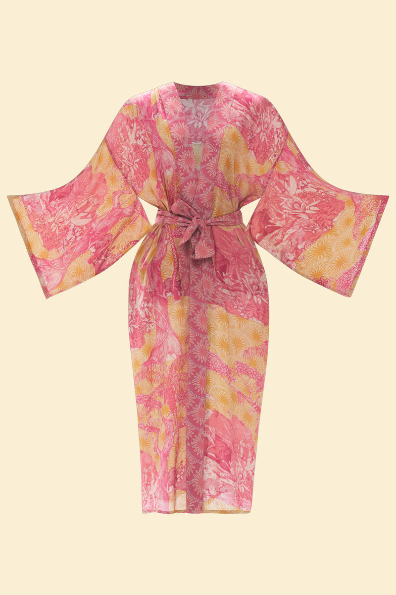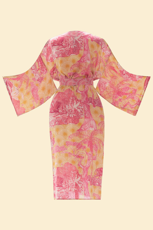 Powder Design's Tropical Toile Kimono Gown - Pineapple and Raspberryenchanting and exotic. The interplay of colors and attention to detail in this toile design makes for something super glamorous this season. Wear it belted in a dress style or open and billowing like an enchanting cape, this gorgeous Kimono also comes with bespoke Powder gift packaging. Fabric: 50% Viscose / 50% Modal.