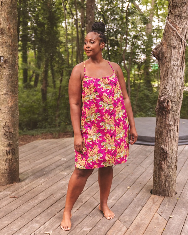 Printfresh Bagheera loungewear is one we are all WILD for. The design is of wild felines on a hot pink background. The nightgowns are sewn from a lightweight, breathable cotton poplin that becomes softer with each wash. This breezy nightgown was made for easy lounging. Adjustable straps cross over at back. Elastic at center back for a little stretch. 30-32" in length with in-seam pockets.