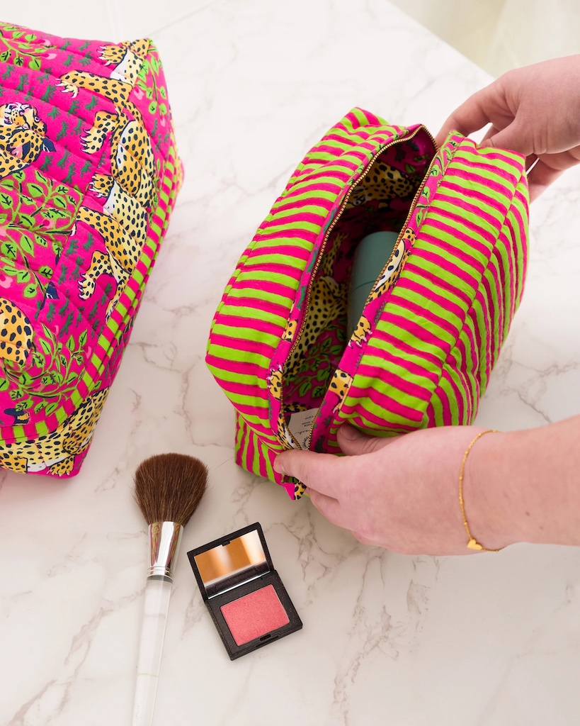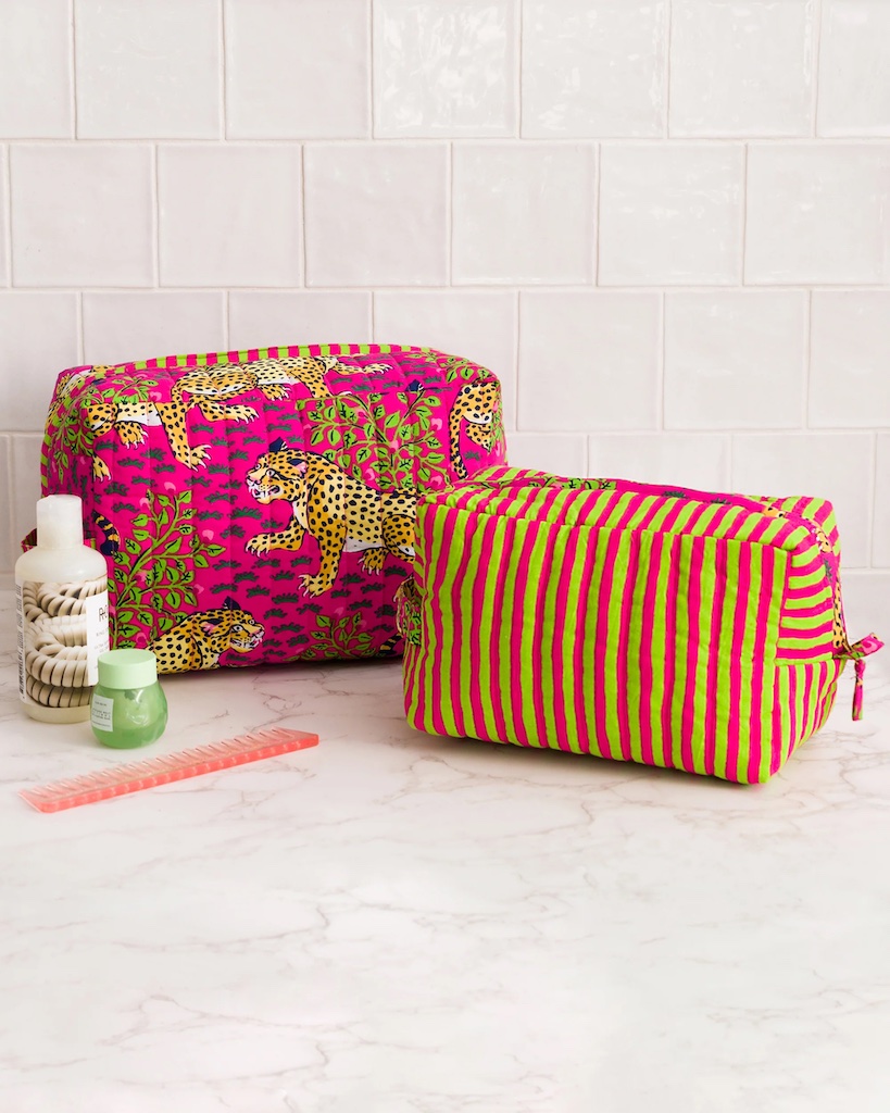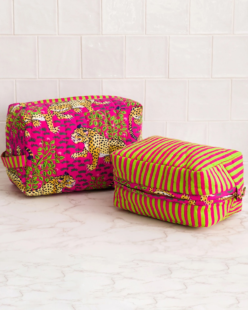Printfresh Bagheera Makeup Pouch Set is a pouch for every shade of lipstick. Your makeup deserves its own tender, love and care. The large pouch features our Bagheera leopard while the medium size is printed with a colorful stripe design. Quilted cotton that’s soft & stylish. Includes two sizes in coordinating mixed & matched prints.