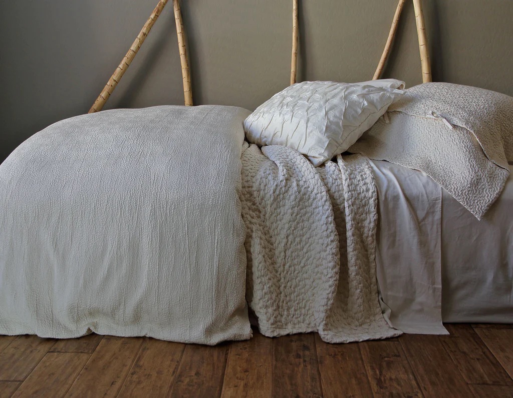 SDH The Purists' Jazz decorative pillows are an exquisite blend of silk and cotton, woven in Italy in a lightweight boutis jacquard. The luxury of silk combined with the livability of cotton in their all-natural SDH bedding line that is brushed with color. The Purists is a cotton/silk blend and is in a shade of natural ecru. 65% organic Egyptian cotton and 35% silk. Woven in Italy.