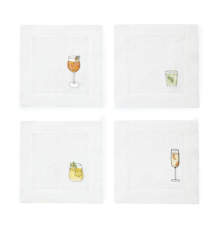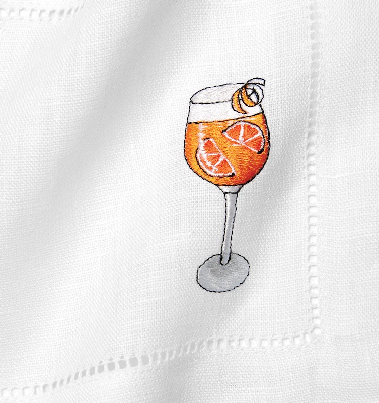 Sferra's Aperitivo Cocktail Napkins will add a cool touch to your party scene with charmingly embroidered cocktail napkins that feature delicious cocktails on a white Festival linen base. Each collection includes 4 different motifs. A set of 4 makes the perfect hostess gift. Embroidered on Festival cocktail napkins. Plain weave linen with machine embroidery. 1-inch hand drawn machine hemstitch. Comes in an organdy gift bag. 100% linen.