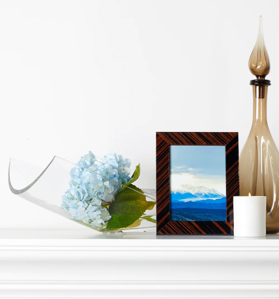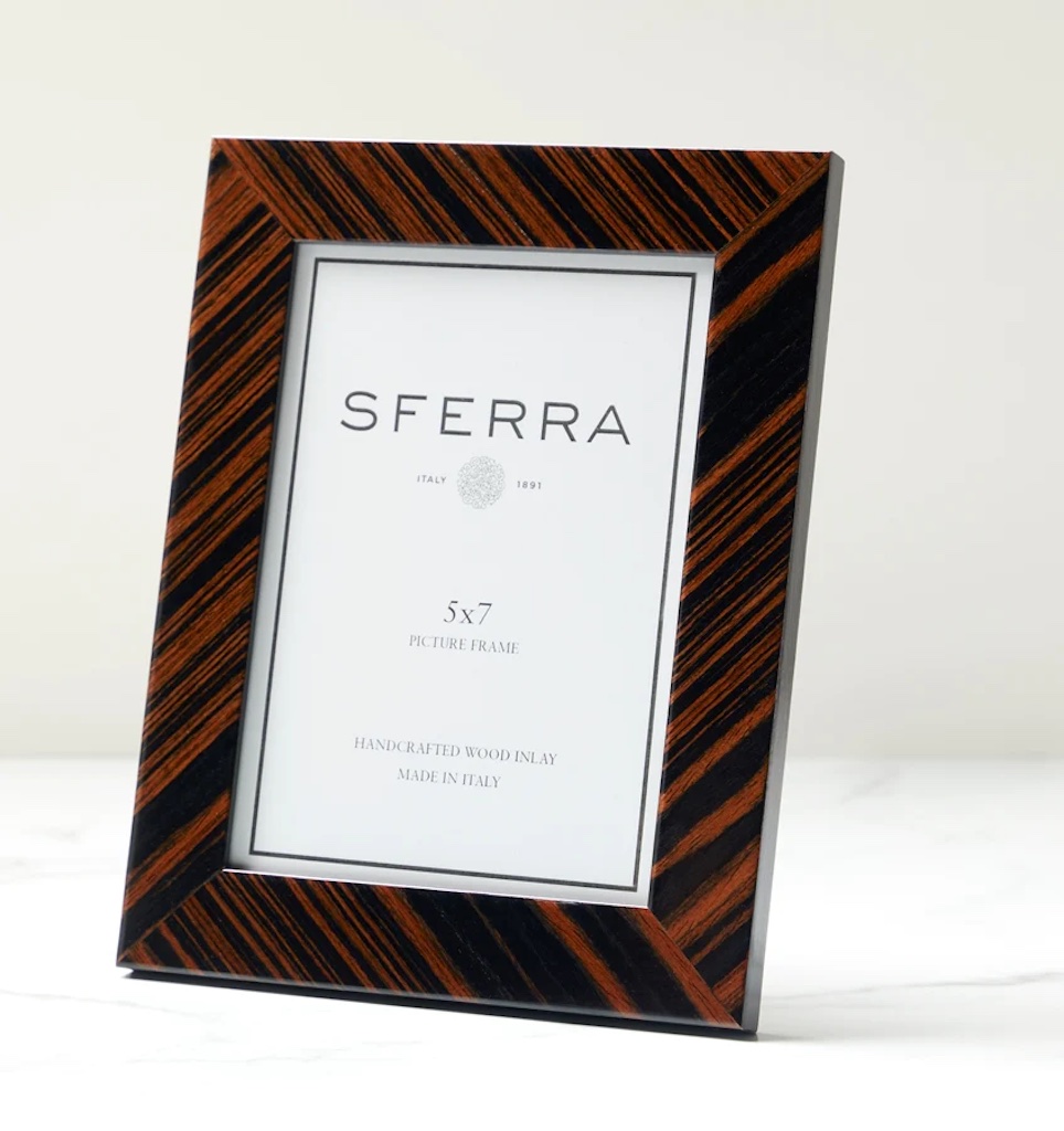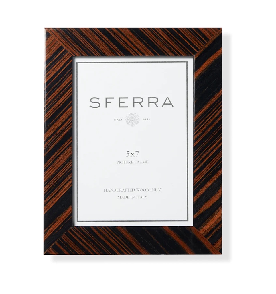Sferra's Atrani Wooden Picture Frame is handcrafted in Italy from tulip wood and poplar, brown and black wood inlay create a bold striped pattern in this beautiful picture frame. 94% Tulip wood / 6% Poplar. Made in Italy.