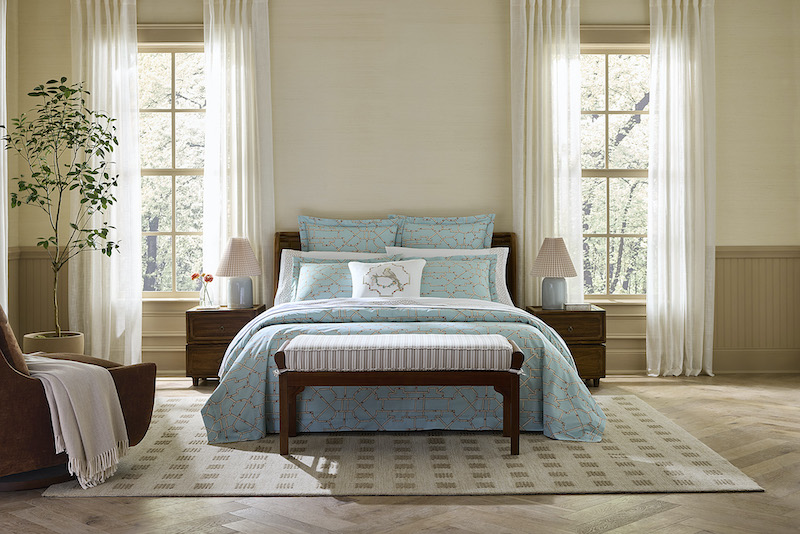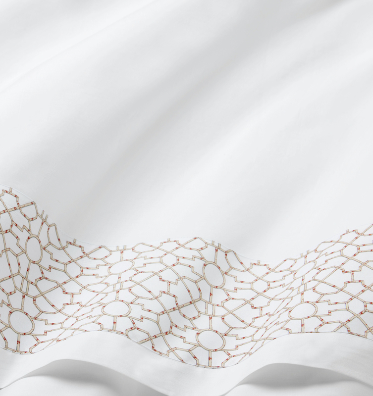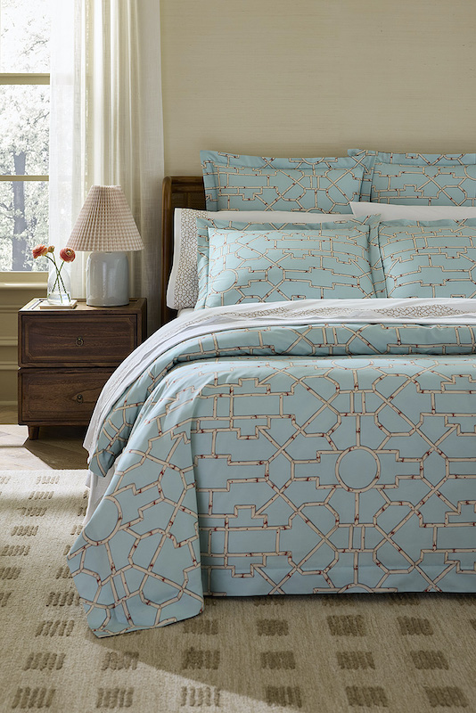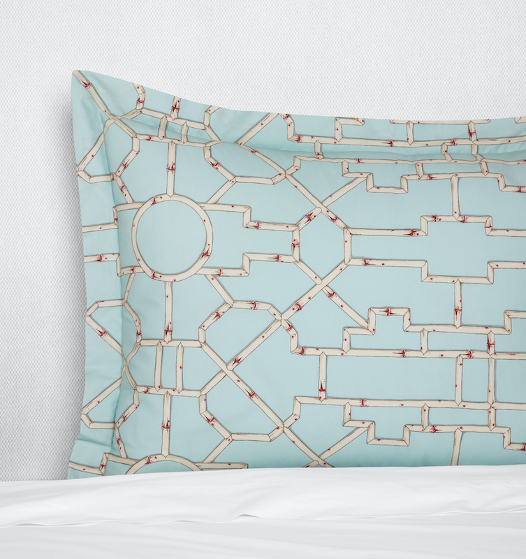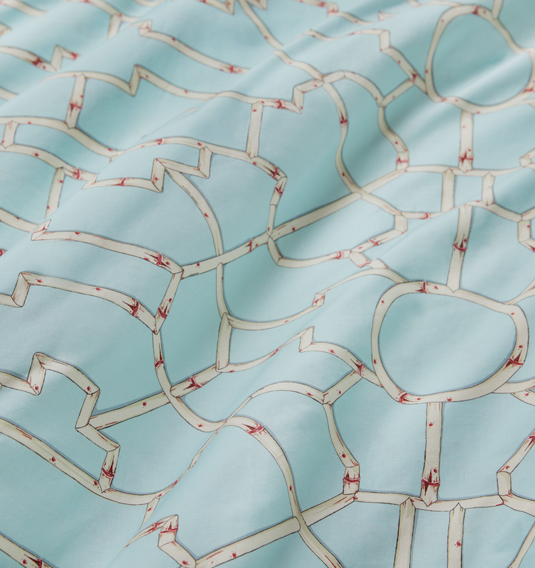 Crafted through a partnership with Scalamandre, the Baldwin Bamboo collection showcases a sophisticated bamboo lattice pattern rooted in traditional Asian design aesthetics. The composition balances warm cream tones with vibrant red and aqua accents, creating visual depth and cultural resonance. Constructed from premium 100% long-staple cotton and woven in Italy, this textile delivers both refined and exceptional durability for discerning interiors.