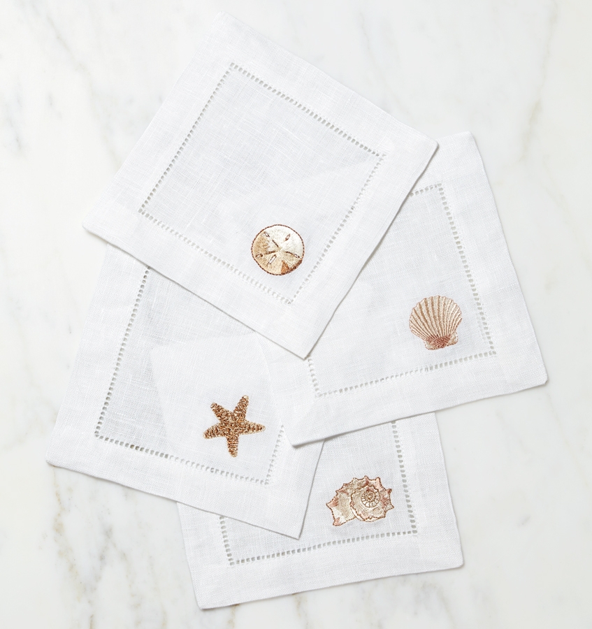 Sferra's Beachcomber cocktail napkins feature four delightful seashell