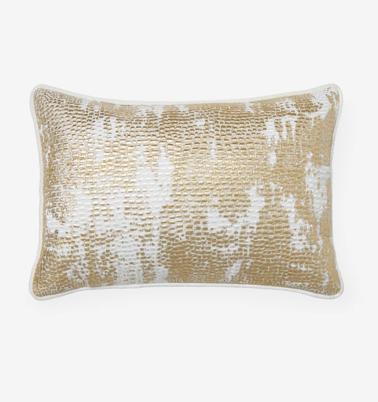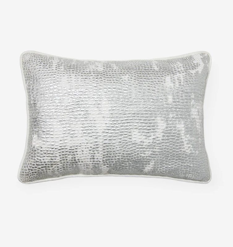 Sferra's Bisce decorative pillow has velvet piped edges and a metallic print over python-textured embroidery. This pillow adds sophisticated allure and texture to any interior. Piped edge and
