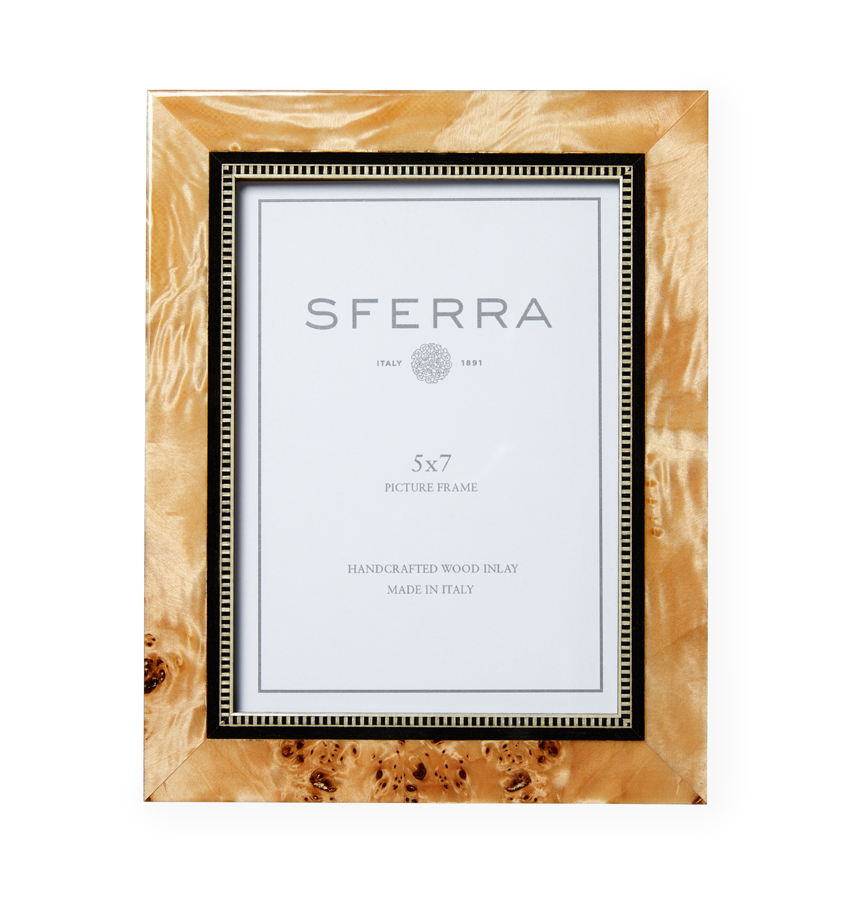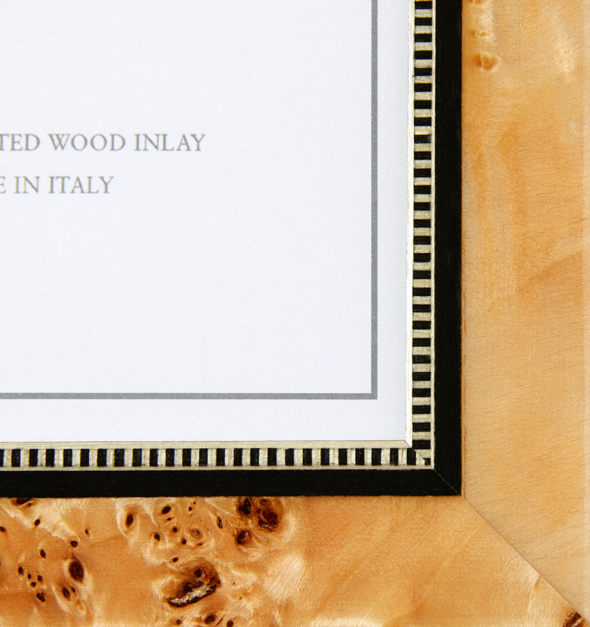 Sferra Catania frame is a gorgeous tan wooden frame with an intricate inlay. The wood is tulip and poplar and the inlay adds contrast and elegance to the whole design. This frame would be a perfect wedding gift or for other just as special occasions. 94% tulip wood and 6% poplar. Crafted in Italy by expert artisans.