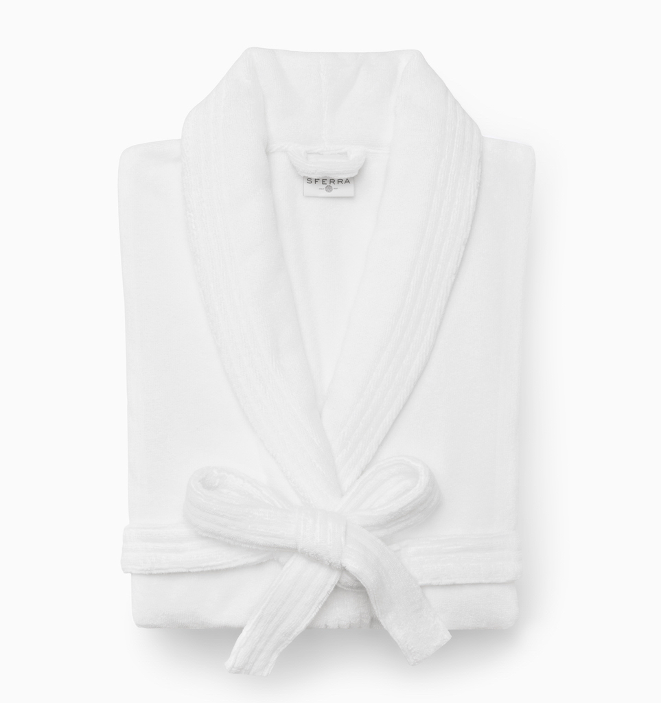 Sferra's Cielo Robe is pure indulgence. These robeshave meticulously zero twisted yarns which creates a beautiful shine and lustrous hand feel. This technique also makes towels feel incredibly light, soft and makes them extremely absorbent. 100% Long staple Cotton. Piece dyed. Woven border end hems. 450GSM towels. Portugal.