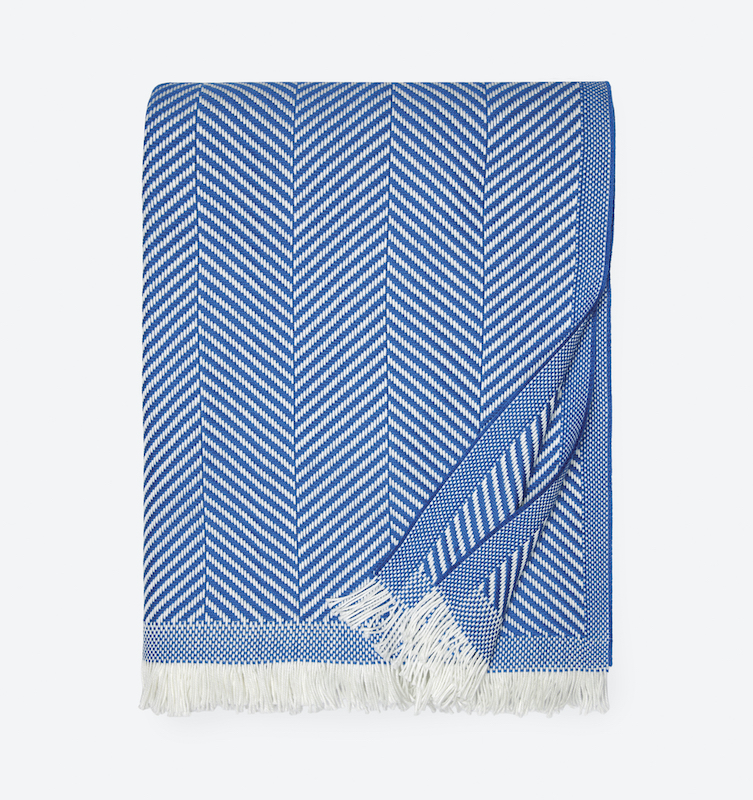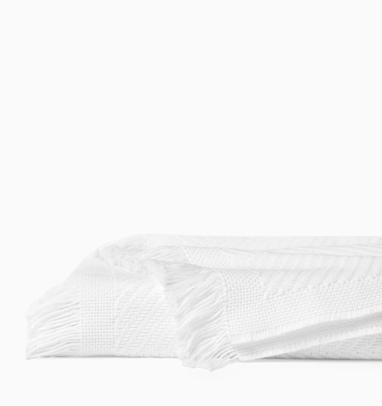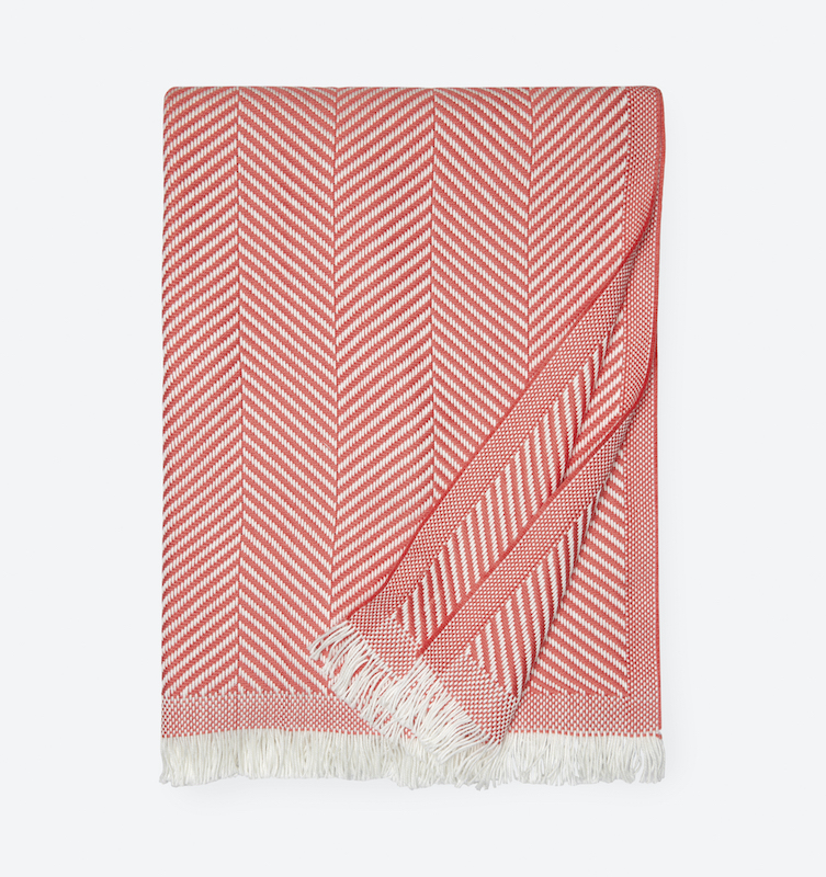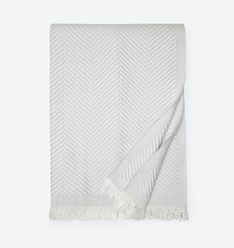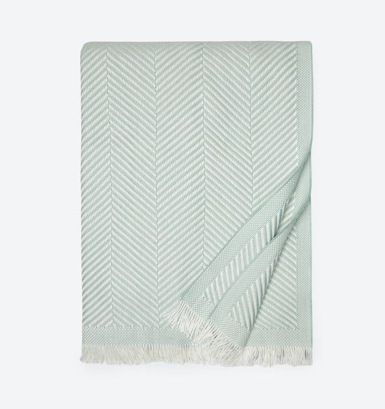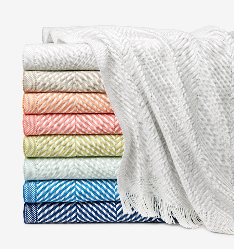 Sferra's Costa throws are light and cheerful. It is a throw of white and colorful threads that are woven into a crisp herringbone pattern. It's lightweight cotton throw redolent of sun-dappled mornings in Nantucket. They are great during a cool breeze or to add a pop of color to your favorite chair. Selvedge on all sides with fringe on top and bottom. Yarn-dyed. 100% cotton. Made in Italy.