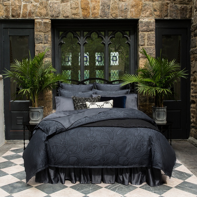 Art Deco style influenced the exuberant, modern patterning of our Danello design, Bold florals arc and curl across its face, woven in debonair shades of Indigo and inky, midnight black. These flowery motifs intermix with lavish ornamental friezes for a contemporary bed linen that channels pure glamour.