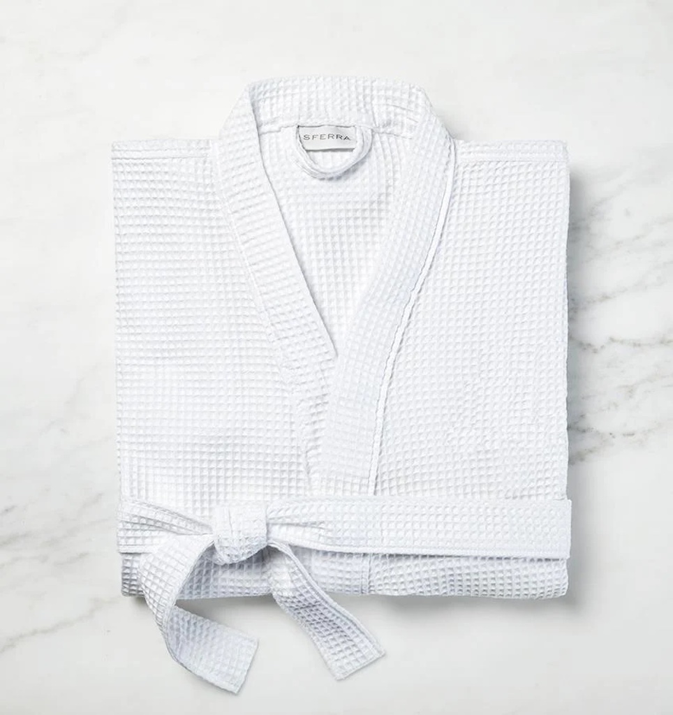 Sferra's Edison Robe is a lightweight unisex robe features a waffle weave texture in a kimono-style cut. It makes the ideal spa-inspired companion for any climate. Waffle weave. Kimono-style, rolled collar. 2 patch pockets. Self tie with loops. 70% Cotton / 30% Polyester. Turkey.