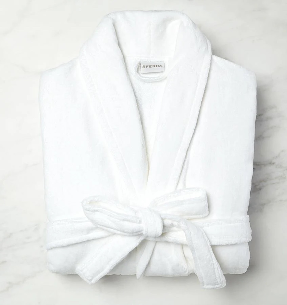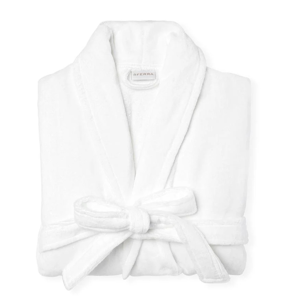 Sferra's Fairfield Robe is plush, cozy, and warm. Fairfield is an ultra-smooth, cotton velour unisex robe is designed to keep you perfectly pampered. Fairfield features a shawl collar and two patch pockets for the most luxurious and chic lounge style. Shawl collar. 2 patch pockets. Self tie with loops. 100% cotton velour. Turkey.