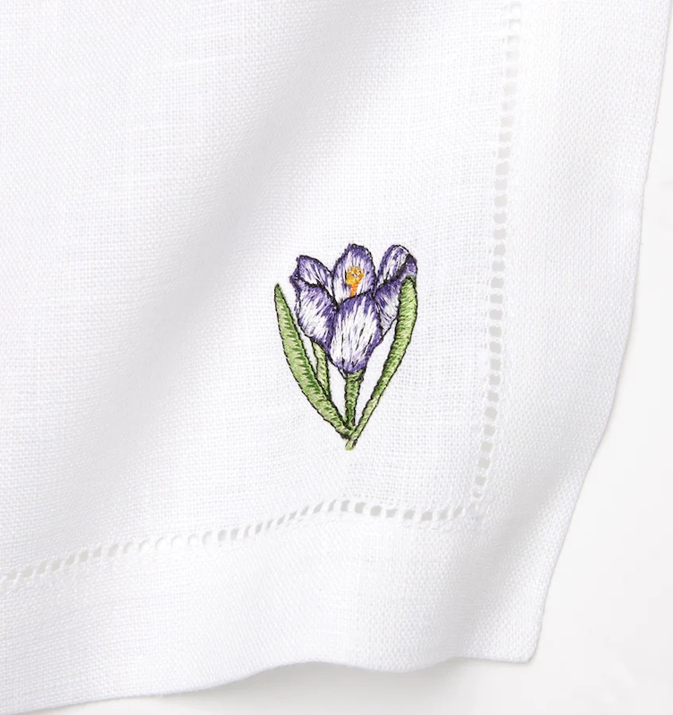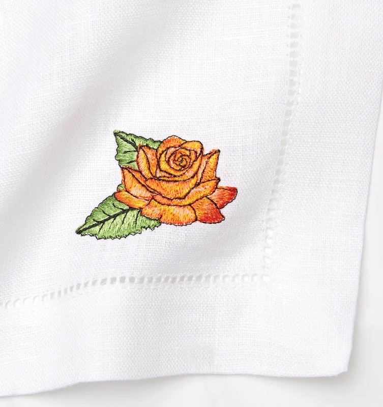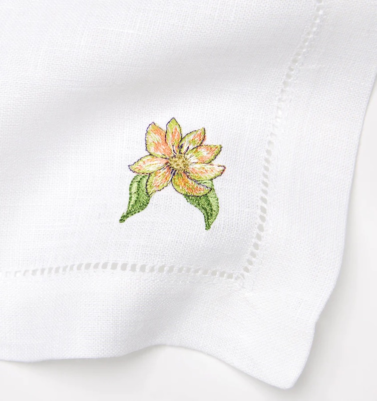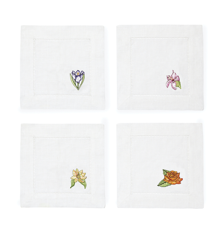 Sferra's Fioritura Cocktail Napkins will add a cool touch to your party scene with charmingly embroidered cocktail napkins that feature gorgeous garden flowers in full bloom on a white Festival linen base. Each collection includes 4 different motifs. A set of 4 makes the perfect hostess gift. Embroidered on Festival cocktail napkins. Plain weave linen with machine embroidery. 1-inch hand drawn machine hemstitch. Comes in an organdy gift bag. 100% linen.