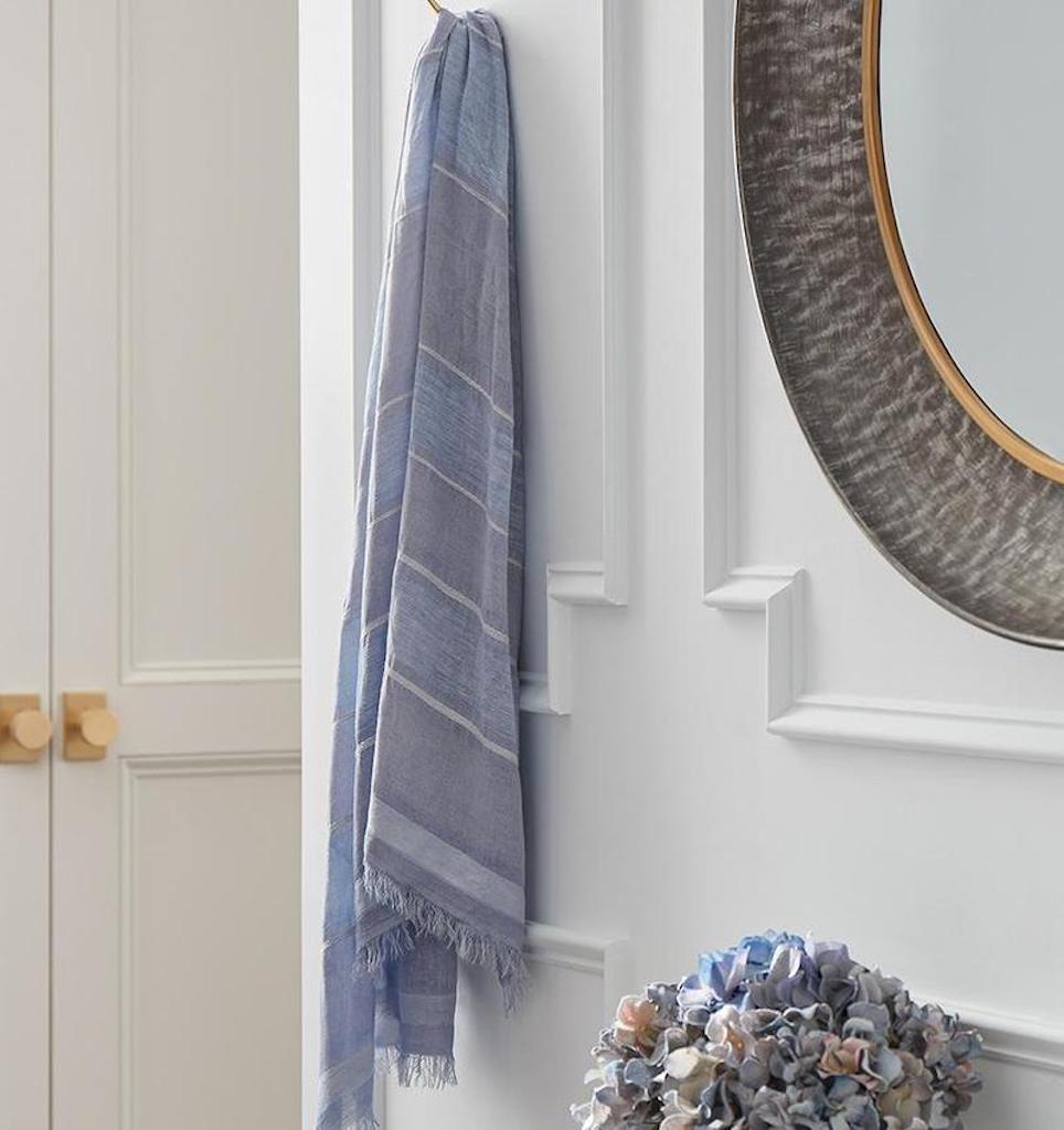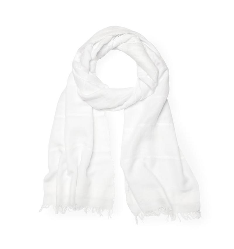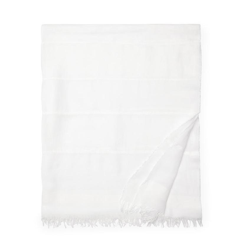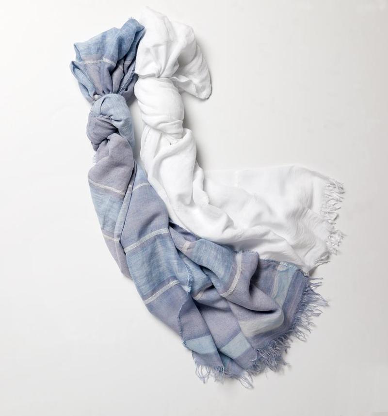 Sferra's Garda scarf is a light and airy. Made of a delicate blend of linen, modal and fine yarns. Garda is woven with a subtle jacquard pattern in alternating stripes for a look of casual sophistication, and finished with soft eyelash fringe detailing for a dreamy touch. Cold-dyed. 39% Viscose / 27% Modal / 18% Cotton / 10% Linen / 5% Silk / 1% Polyester. Made in Italy.