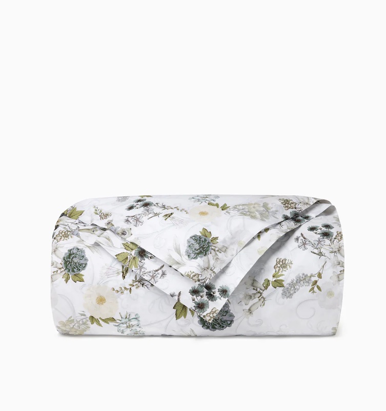 Sferra's Incanto's composition is airy yet intentional, a careful arrangement that brings the calm of a garden indoors. There’s a hush to Incanto, as if the flowers themselves are mid-whisper. Printed on smooth Italian percale, its delicate botanicals bloom in soft, painterly strokes—each petal and leaf rendered in shades of blue, green, and ivory that feel gathered from a dream. Shams Flanges: 2- Inches, Boudoir: 1.5-Inches. Duvet Covers Flanges: 2.5-Inches. Italy.