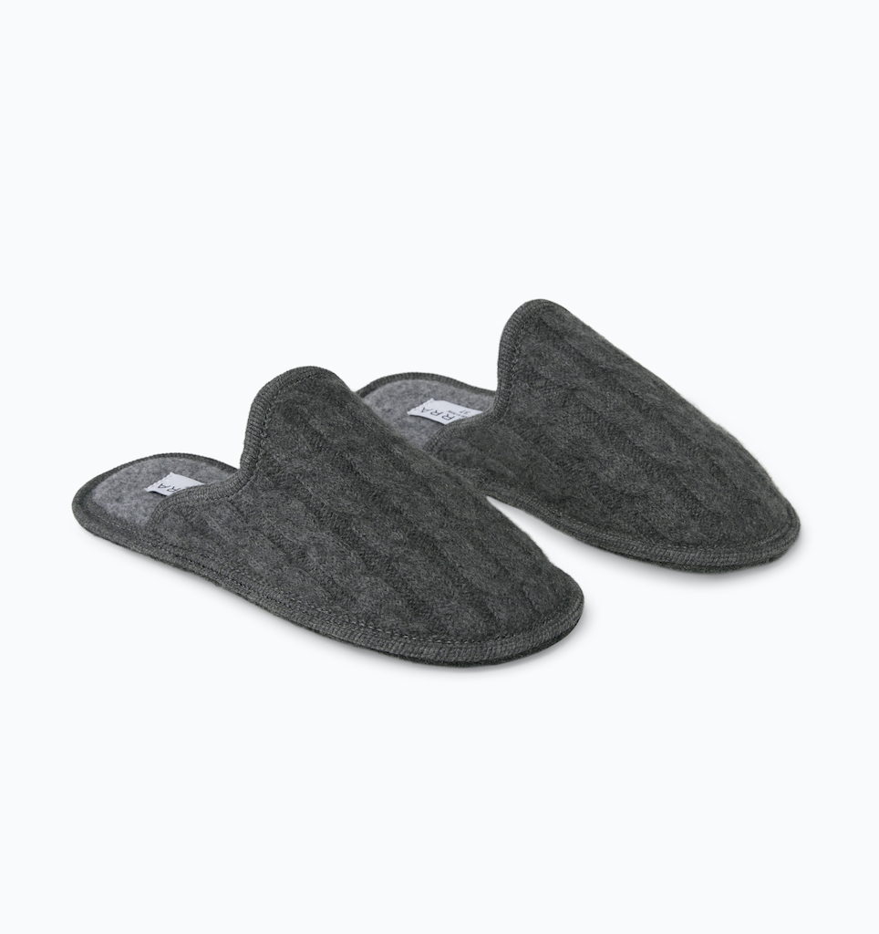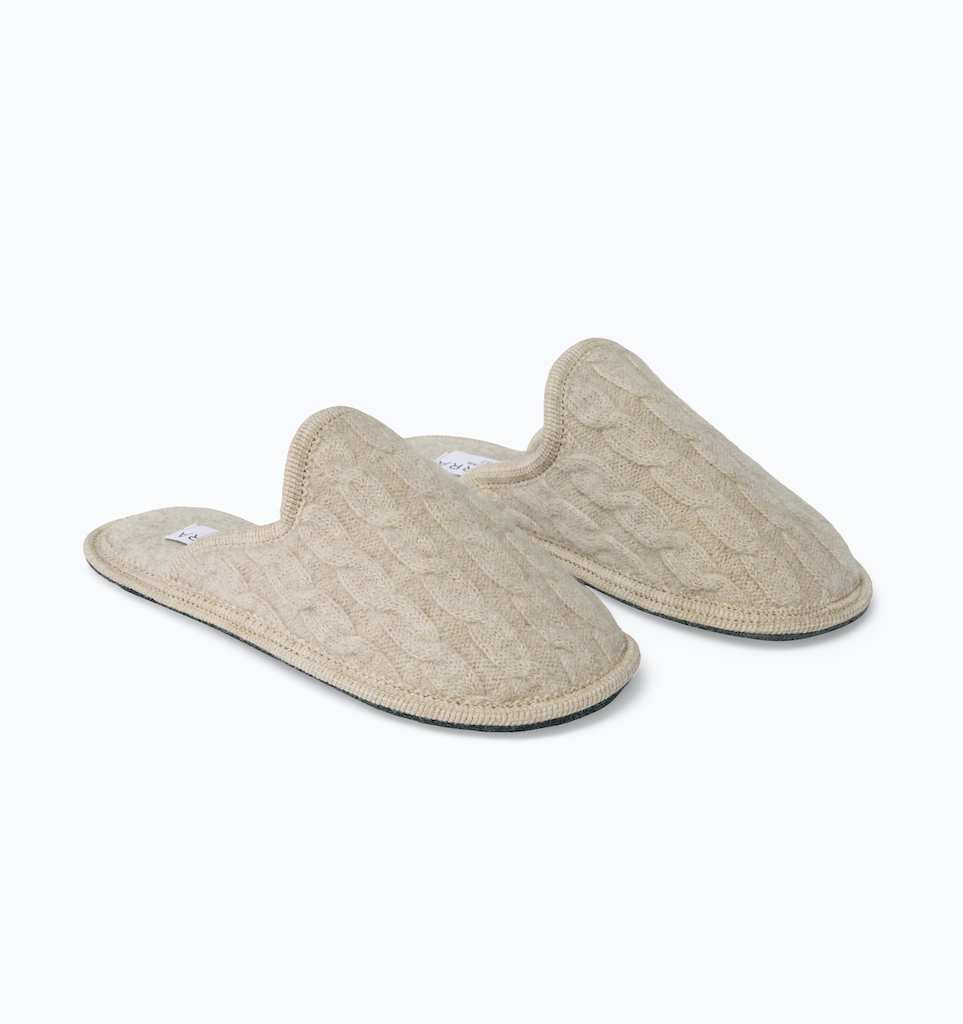 Sferra's Leta Women's Slippers are sophisticated and cozy. The wool cable knit design envelops your feet in warmth and lightweight comfort. They have a non-slip coating on the outsole. These are perfect for slow mornings and lazy evenings. Upper/Insole: 100% Wool. Lining: 80%polyester/20% Wool Sole: 100% polyester. Italy.