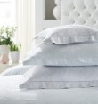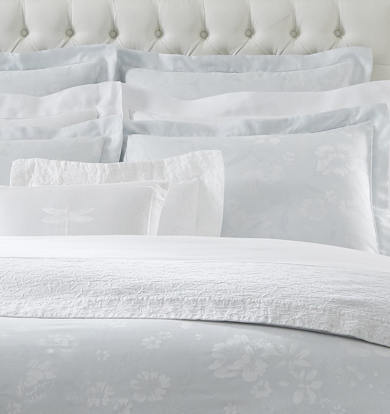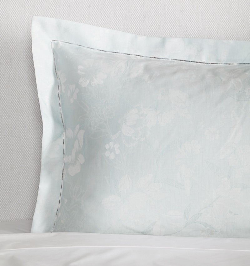 A jacquard woven pattern, Lizana comes in two colors -- frost and platinum. Inspired by the ornate, twining florals of Art Nouveau, Lizana pairs the organic curves of climbing vines with lush blooms. Finished with smaller flanges -- the duvet has a 2.5" flange and the shams are 2".
