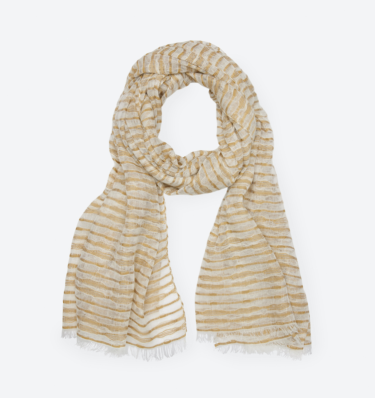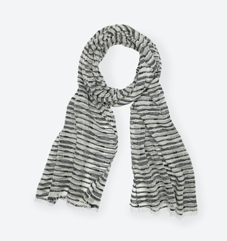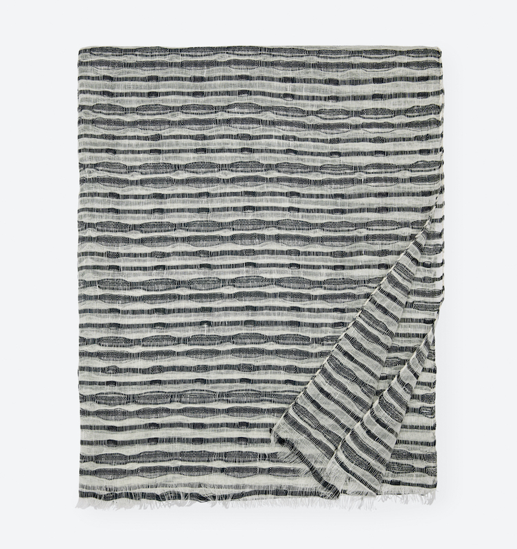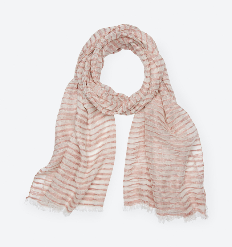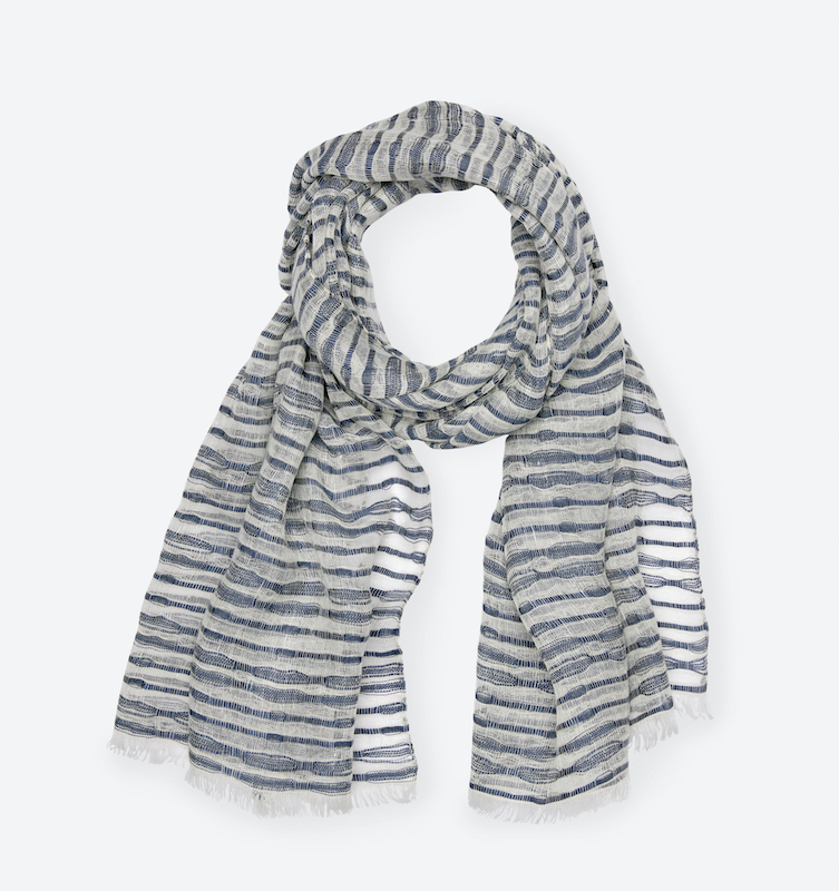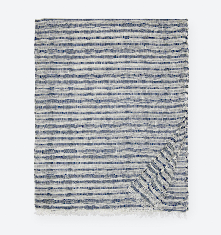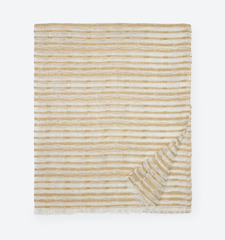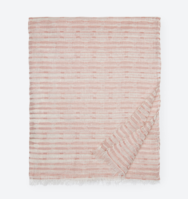 Sferra's Marina Scarf is an open-weave scarf blending the finest linen, silk, and cashmere yarns into pink, golden sand, black, and midnight stripes. Effortlessly accessories for spring and summer with the help of Marina. Yarn-dyed scarf finished with eyelash fringe. 51% Linen, 26% Silk, 23% Cashmere. Made in Italy.