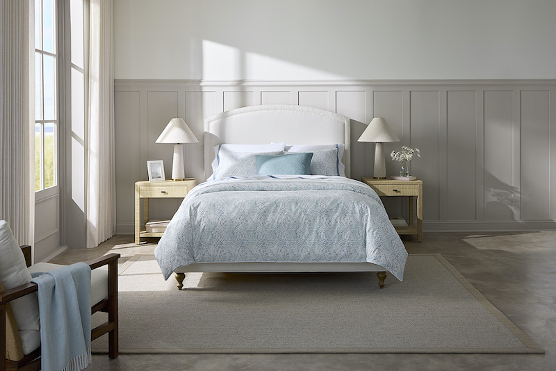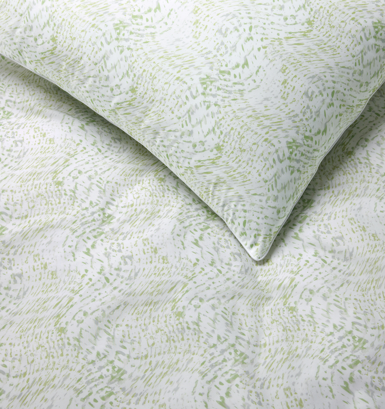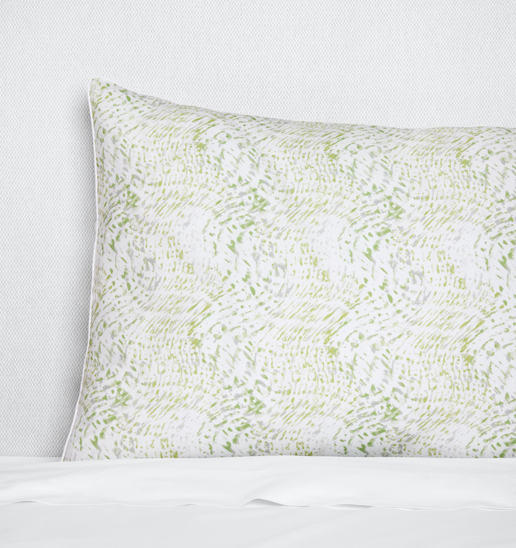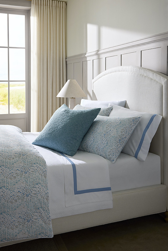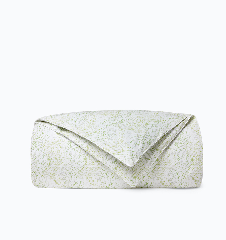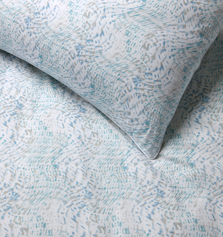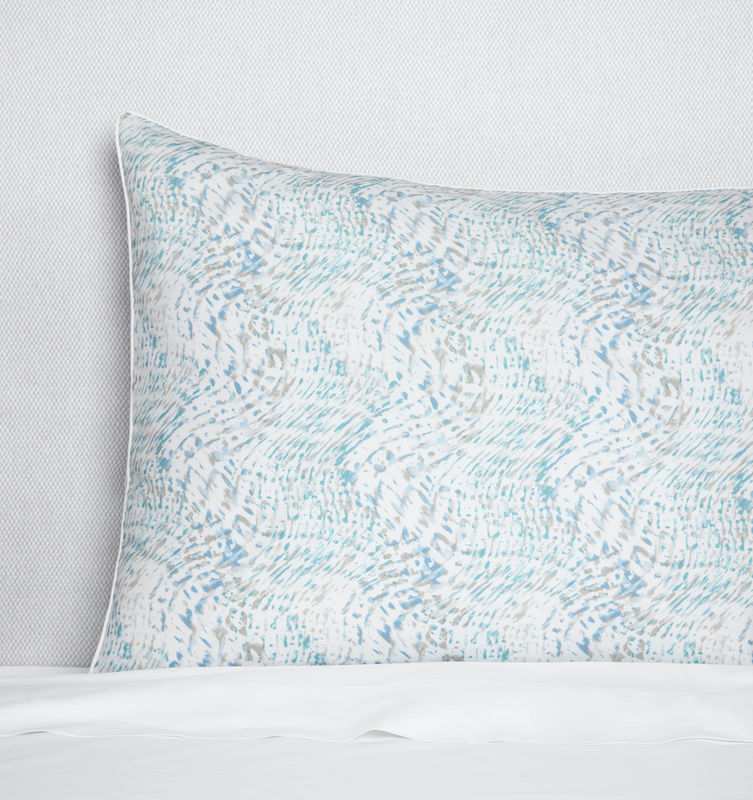 Meloria in Ocean by Sferra showcases nature's raw elegance through expertly crafted printed percale, drawing inspiration from aquatic and geological elements. This Italian-woven collection presents a sophisticated palette of cool blues and greens, complemented by an intricate all-over textured pattern. The duvet's reverse features a coordinated printed border appliqué that adds dimensional interest and reinforces the collection's mineral-influenced aesthetic. A refined choice for those seeking bedding that merges artistic design with tactile sophistication. Italy.