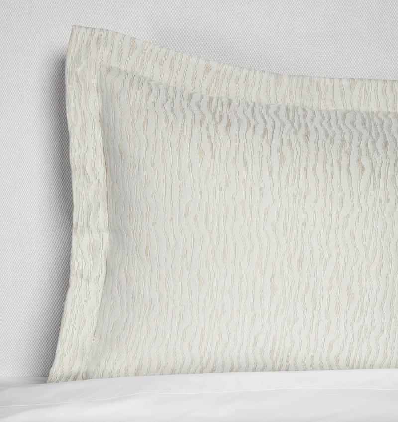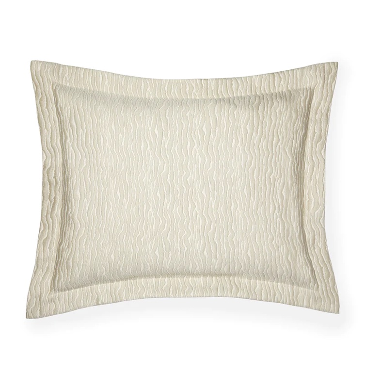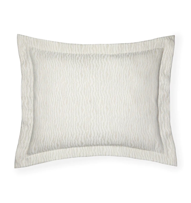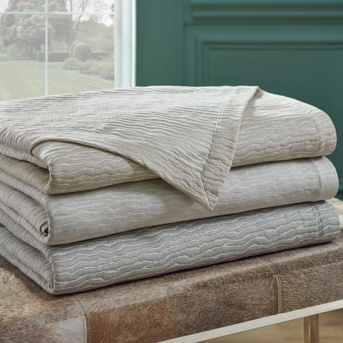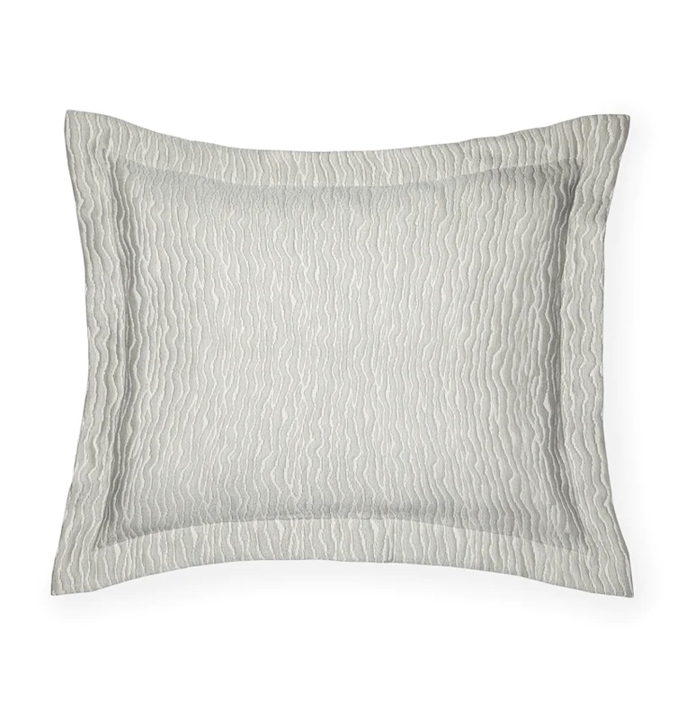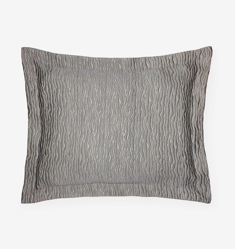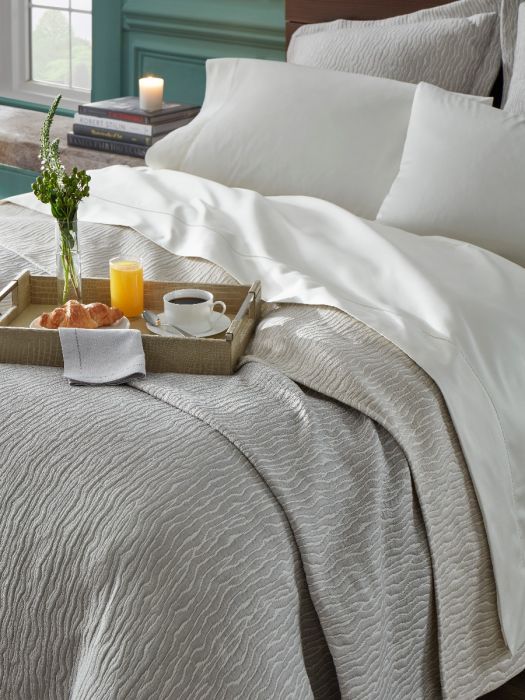 Ondate is a beautiful reversible collection. It has a beautiful undulating pattern that resembles rain. The soft palette is elegant, soothing and exquisite. It will transform your bed into a rolling landscape which has soothing powers. Perfect for a bedroom. 100% long staple cotton yarn dyed. Plain Hem. Made in Italy.