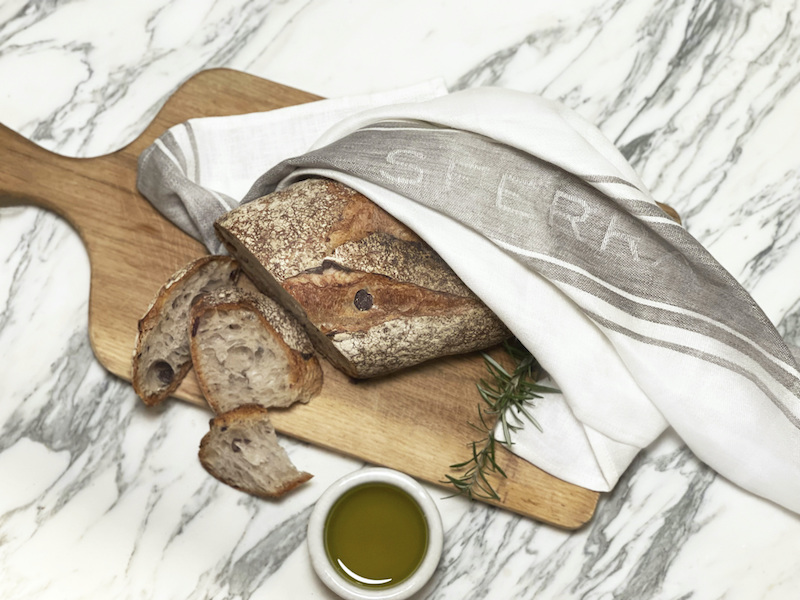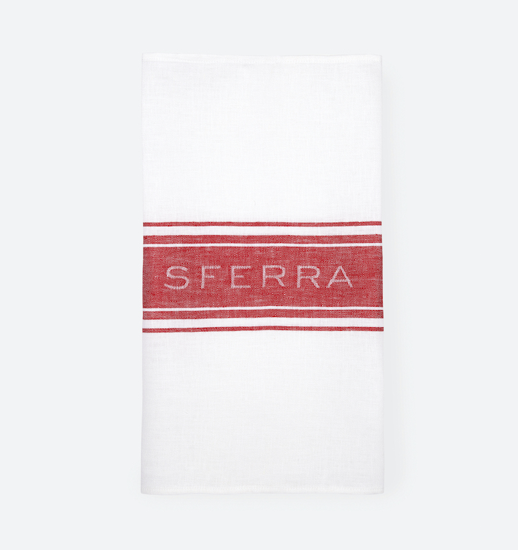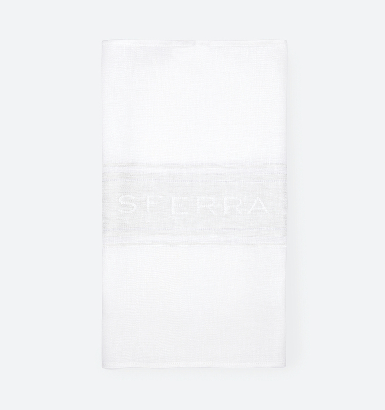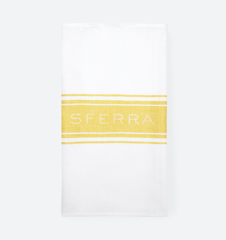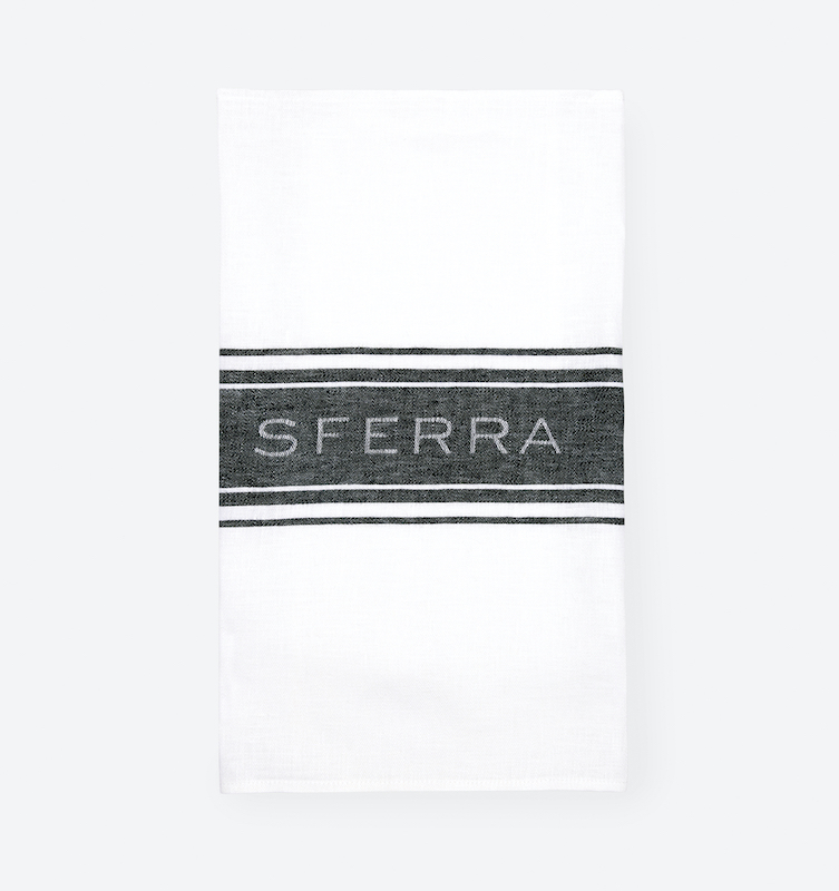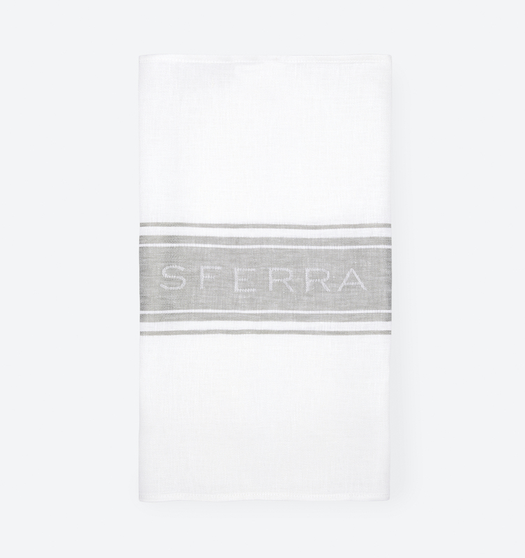 Sferra's Parma Kitchen Towels are a linen towel adorned by a vivid central stripe overlaid by a SFERRA logo. It illuminates the kitchen in an elegant display of functional design and impeccable style. Kitchen Towel come in sets of 2. Available in six color choices. 1/4" Plain hem with two hanging loops. Yarn-dyed Jacquard. 100% Linen.