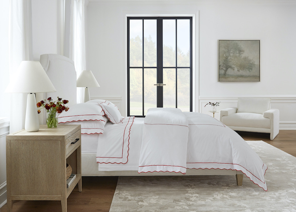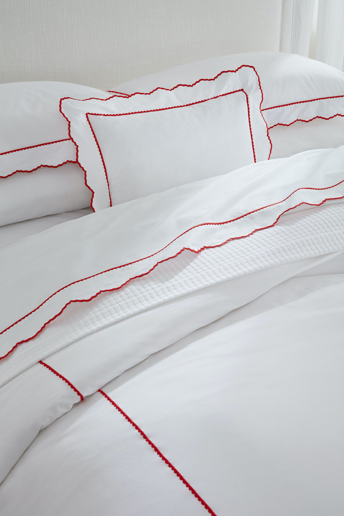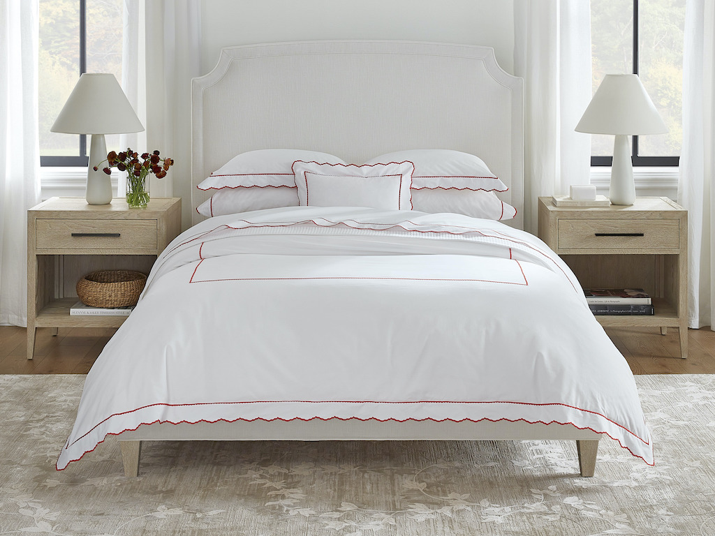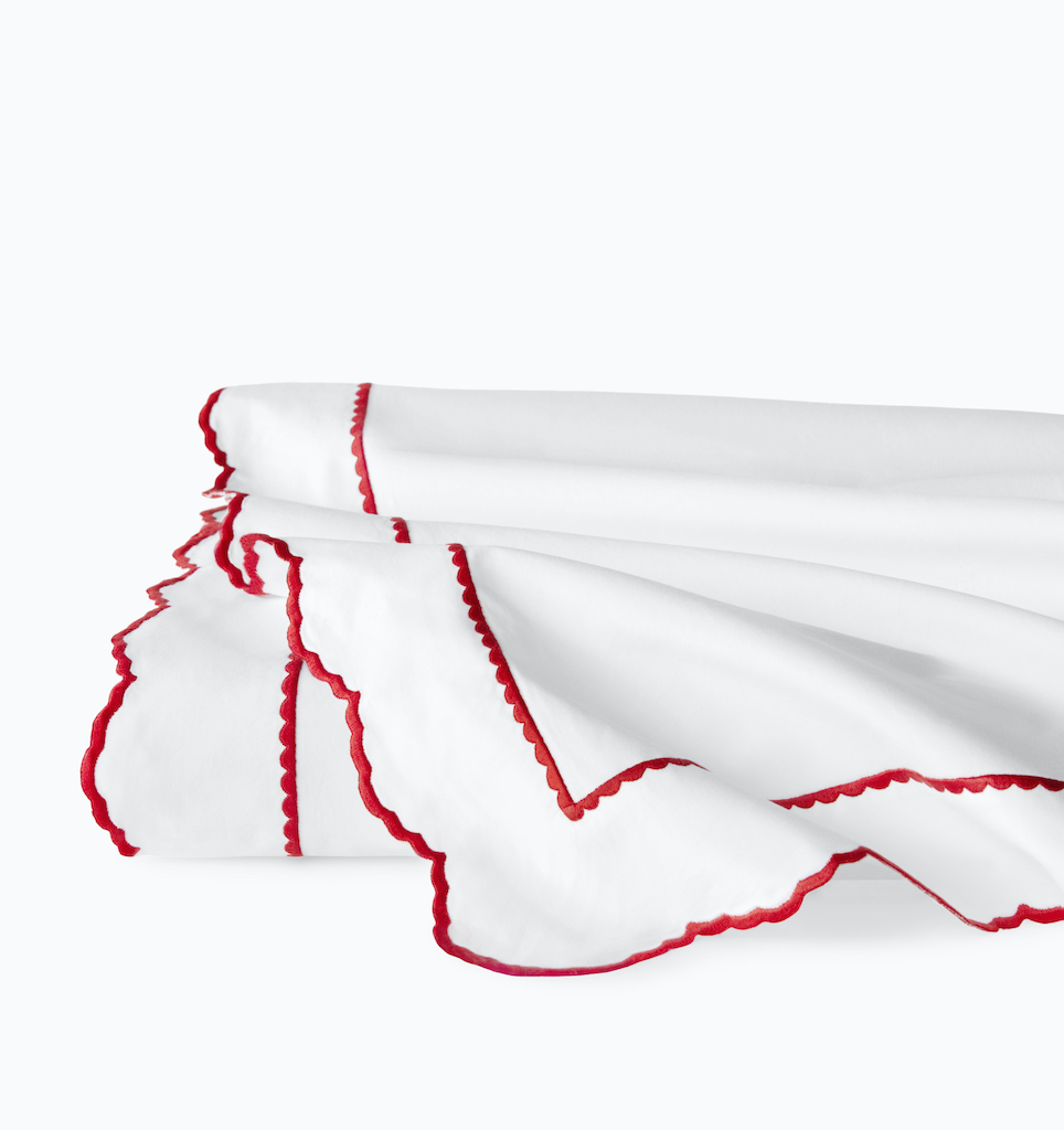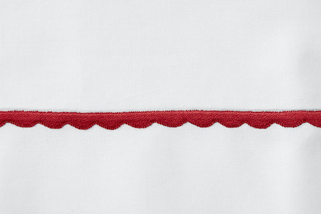 Pettine, which means scallop, is rendered on white Celeste fabric -- our most popular percale. The craftsmanship of Sferra's Pettine embroidered scalloped edge and satin stitch border is pure & simple elegance. Note the dotted effect on the scallop border as well as the satin stitch -- making it unique in the bed linen arena. The perfect Italian tailoring, supple drape give Pettine its remarkable smooth hand-feel. Flanges are 2.5 inches.1 00% cotton and made in Italy. Select tin on white or white on white.