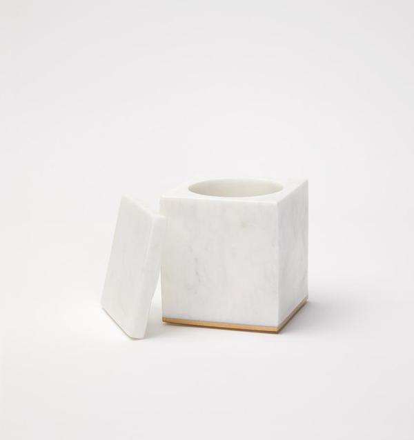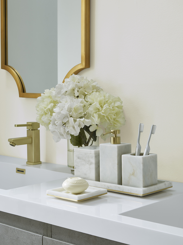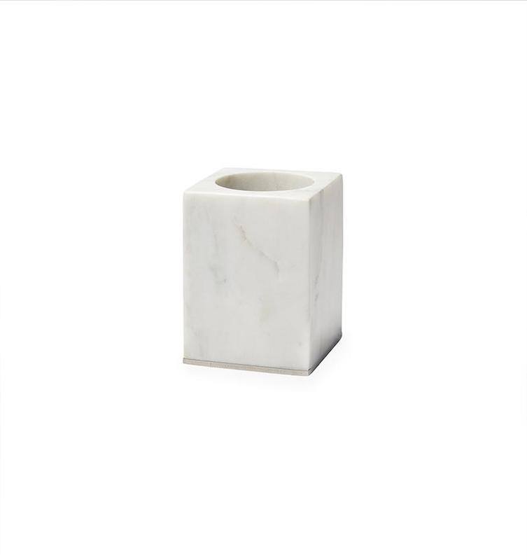 Sferra's Pietra bath accessory collection features a line of marbleware accessories for the home and bath. Tastefully accented with metal details at the bottom. Pietra combines simplicity with functionality to bring forth a deĢcor collection of utmost distinction and ease. Marble and brass.