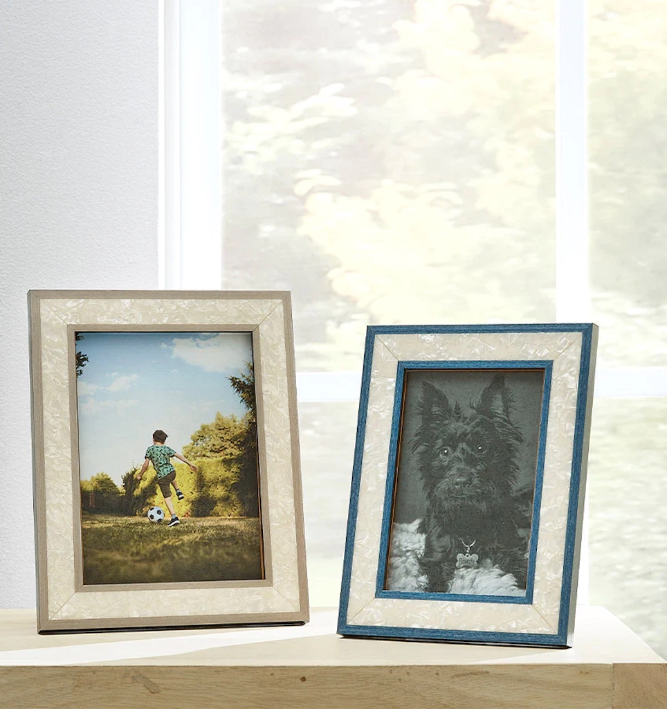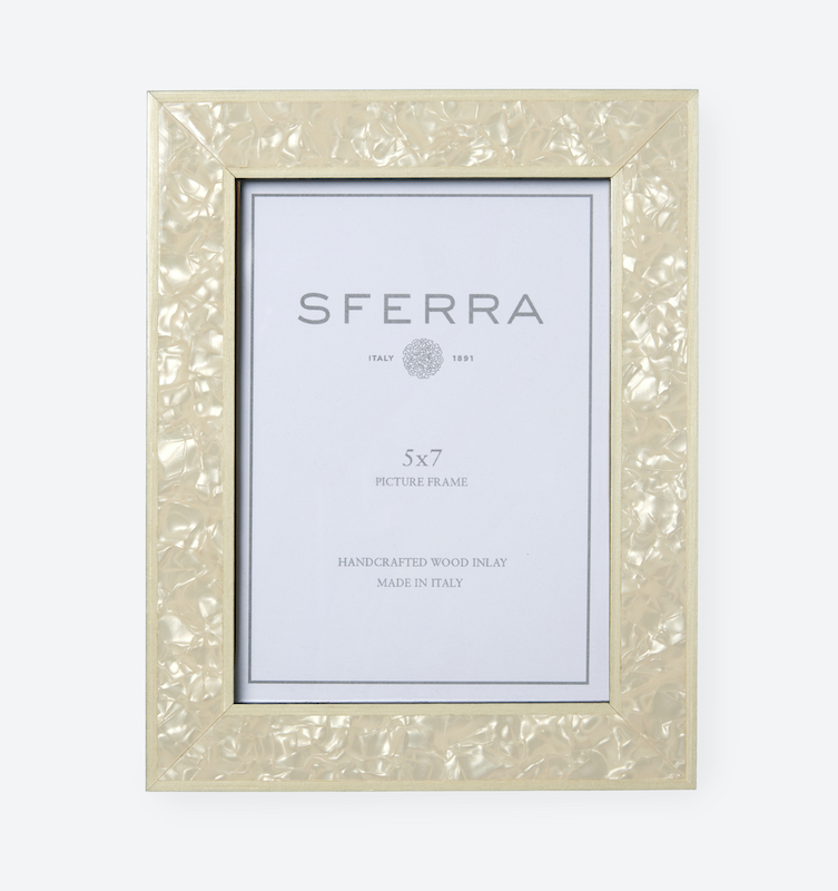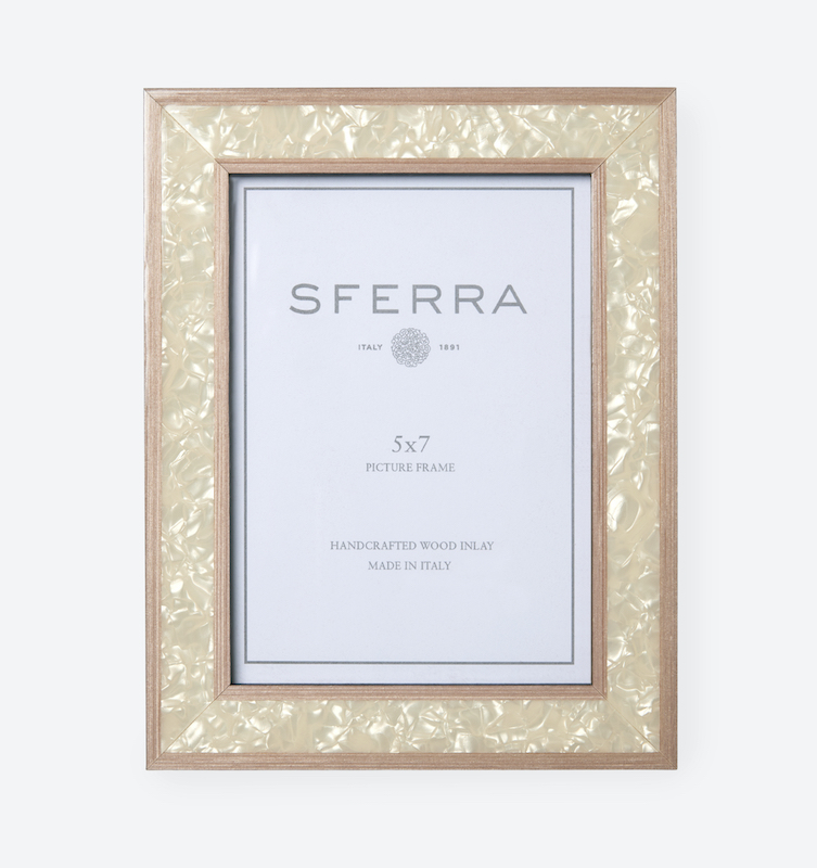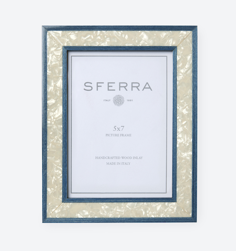 Sferra's Ravello Frame is hand-crafted from Tulip wood and Poplar by Italian artisans. The frame's solid borders delineate a shimmering inlaid panel to highlight photographs with ethereal light. Available in four color choices. These also make great gifts. Frames come boxed. 94% Tulip wood, 4% Celluloid, 2% Poplar. Made in Italy.