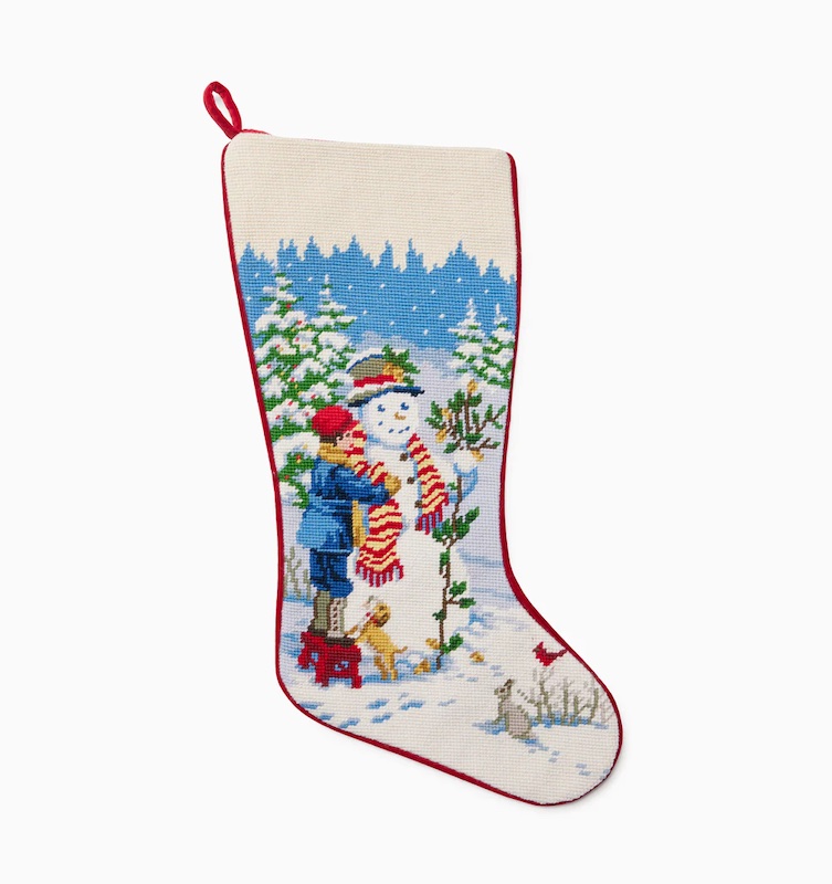 Sferra's Snowman Boy Stocking features delicate hand embroidery on a piece-dyed ground, finished with a solid velvet cuff. A bundled-up child and cheerful snowman share a winter’s moment, evoking the playful innocence of snowy afternoons and shared wonder. With every detail, they evoke the nostalgia of wintry mornings, the glow of tree lights, and the anticipation of gifts to come. Each stocking is crafted to become a lasting piece of seasonal storytelling—hung with care and cherished year after year. Sferra’s holiday stockings are designed to conjure the spirit of holidays gone by—full of wonder, warmth, and quiet tradition. Needlepoint fabrication. Finished with Solid Velvet Piping. Front: 100% Wool Back: 100% Cotton Velvet. Size: 13 x 20"
