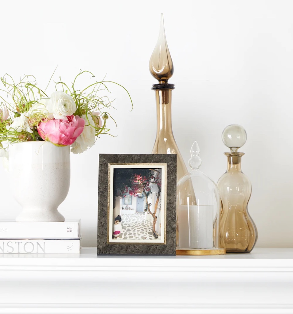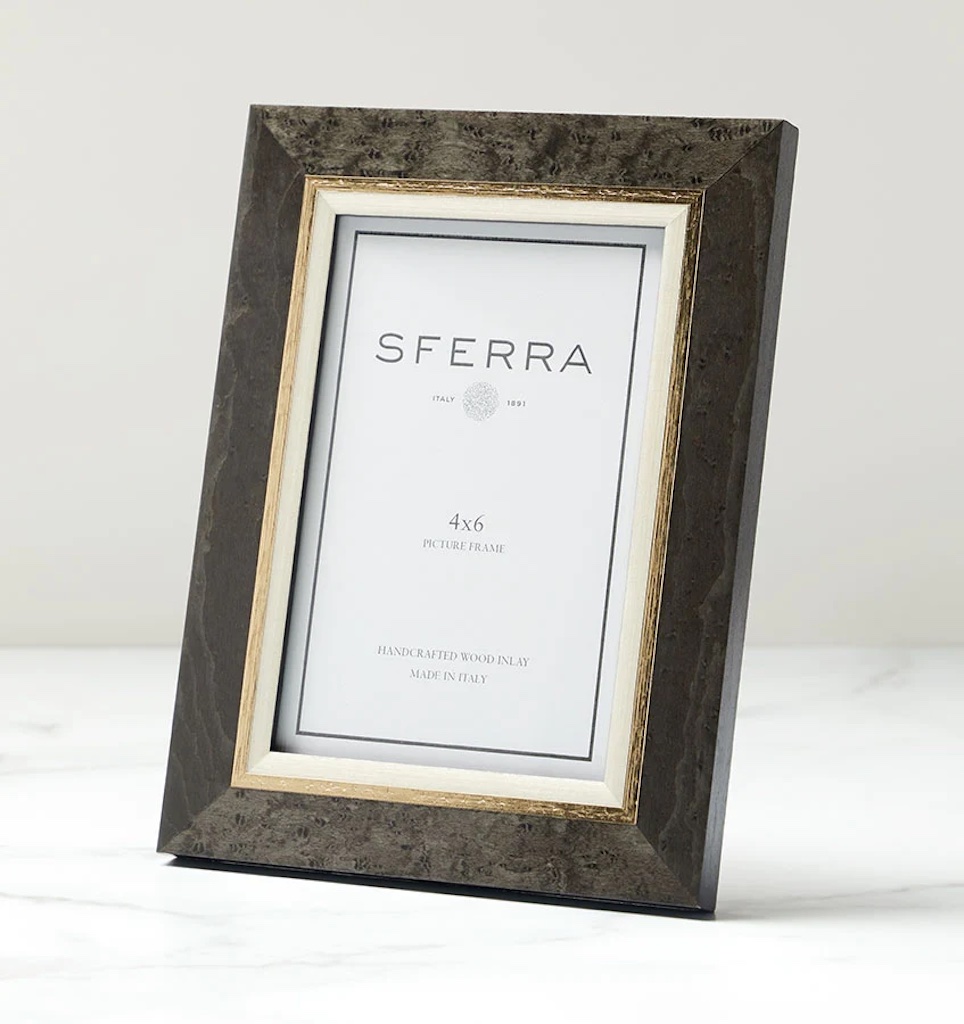 Sferra's Sovana Wooden Picture Frame features a grey, marbled finish, offset by a gold- and ivory-colored inlay trim. It is handcrafted in Italy from natural woods. 94% Tulip wood / 4% Erable / 1.8% Poplar / 0.2% hot stamping foil gold color. Made in Italy.
