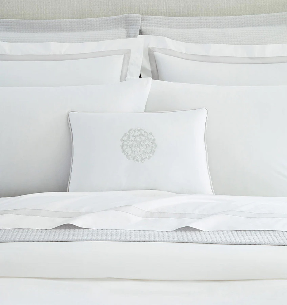 Sferra's Storia decorative pillow will a touch a class anywhere, whether it be a chair or your bed.   It has a certain ornate beauty that will captivate the eye with its romantic lace ball embroidery.  Machine embroidery on sateen. Contrast self-piped edge.  Hidden zipper.  Insert is 95% feather and 5% down.  100% long-staple cotton.  Italy.
