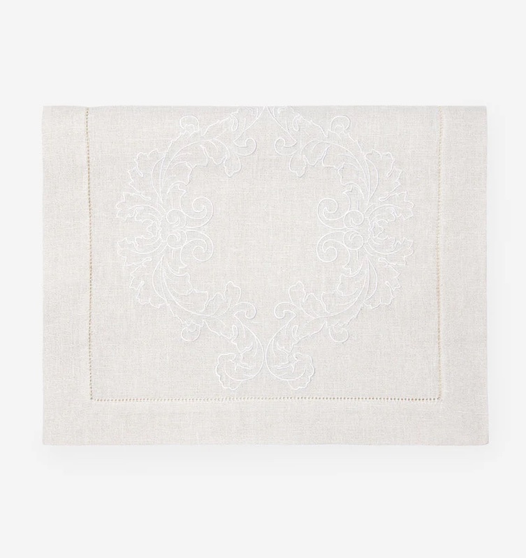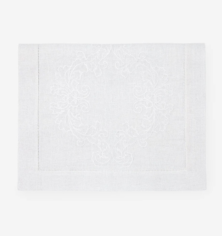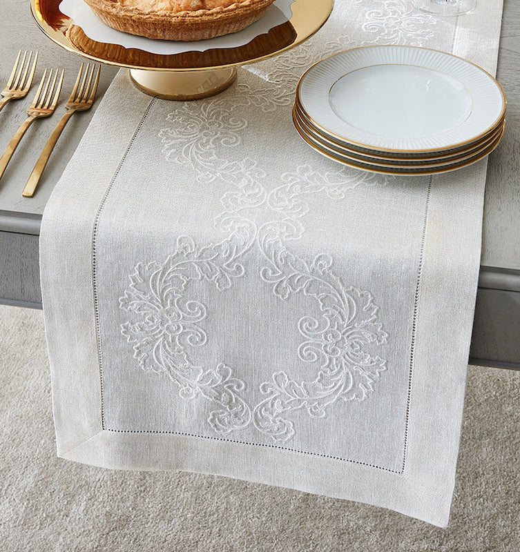 Sferra's Tissi table runners recall the architectural grandeur of the Italian Renaissance. Tissi's ornate motif is woven in white thread over a sumptuous metallic silver or gold linen base. Finishing is a