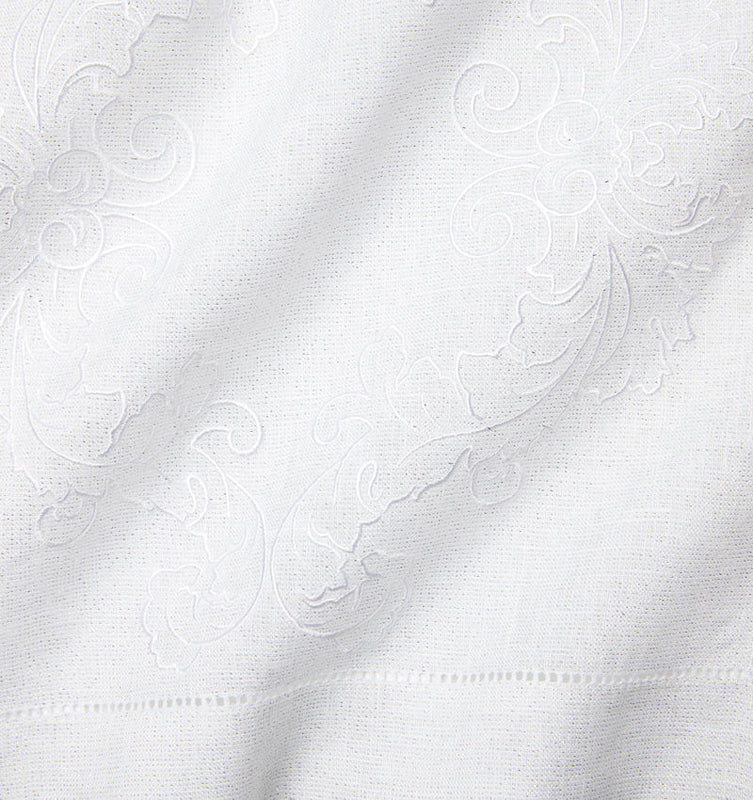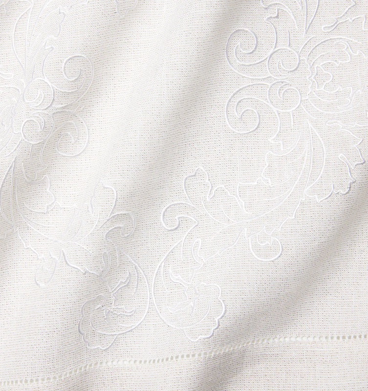 plain weave linen with machine embroidery. Machine hemstitch. 100% linen.