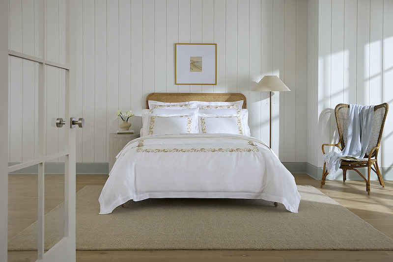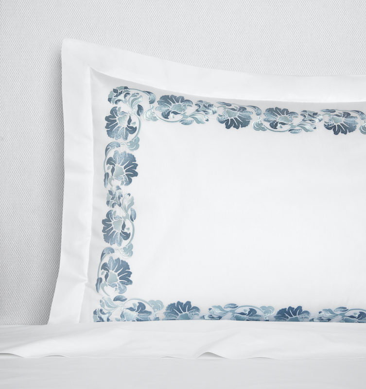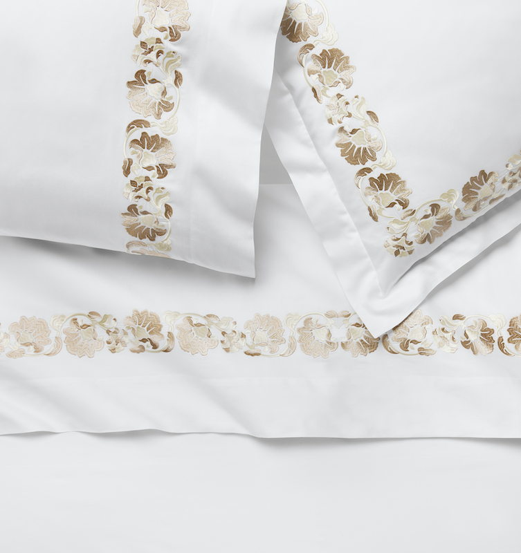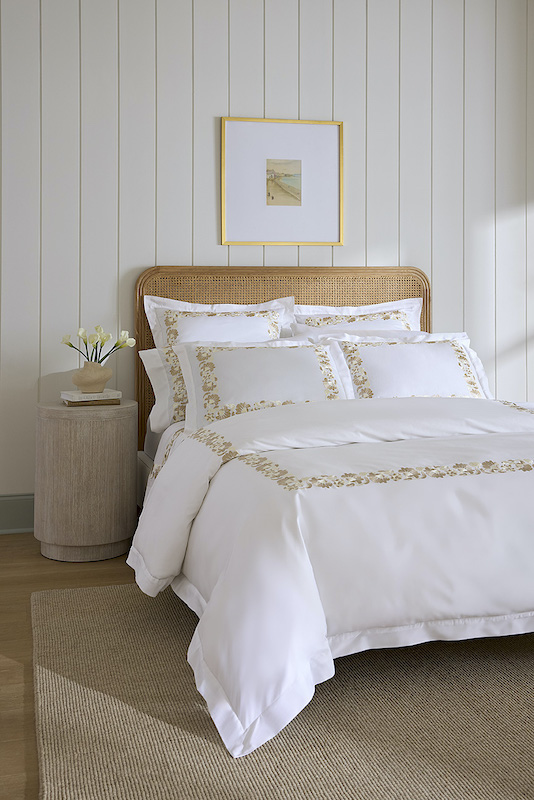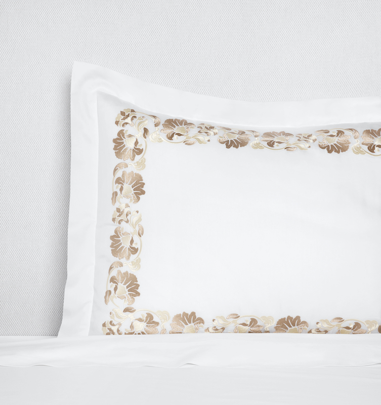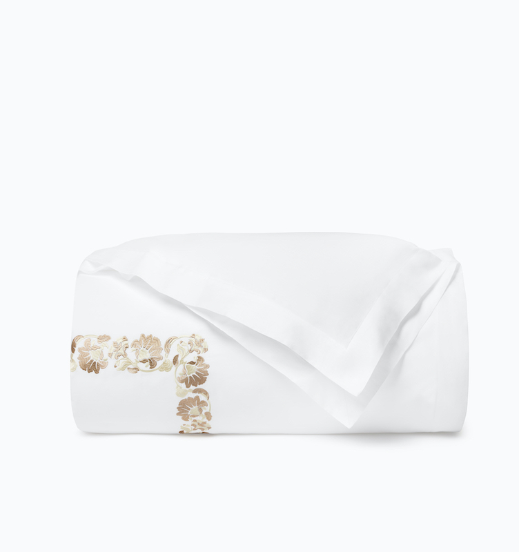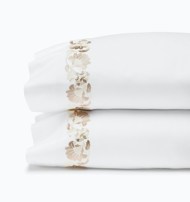 Tralcio in White/Sand showcases Sferra's mastery of Italian textile craftsmanship, featuring delicate vine embroidery that traces the perimeter of a pristine white sateen foundation. The botanical-inspired design captures the fluid, organic essence of natural growth patterns, while the collection's refined thread work demonstrates the precision and artistry inherent to traditional weaving techniques. This sophisticated piece introduces understated luxury and timeless elegance to your bedroom sanctuary. Italy.
