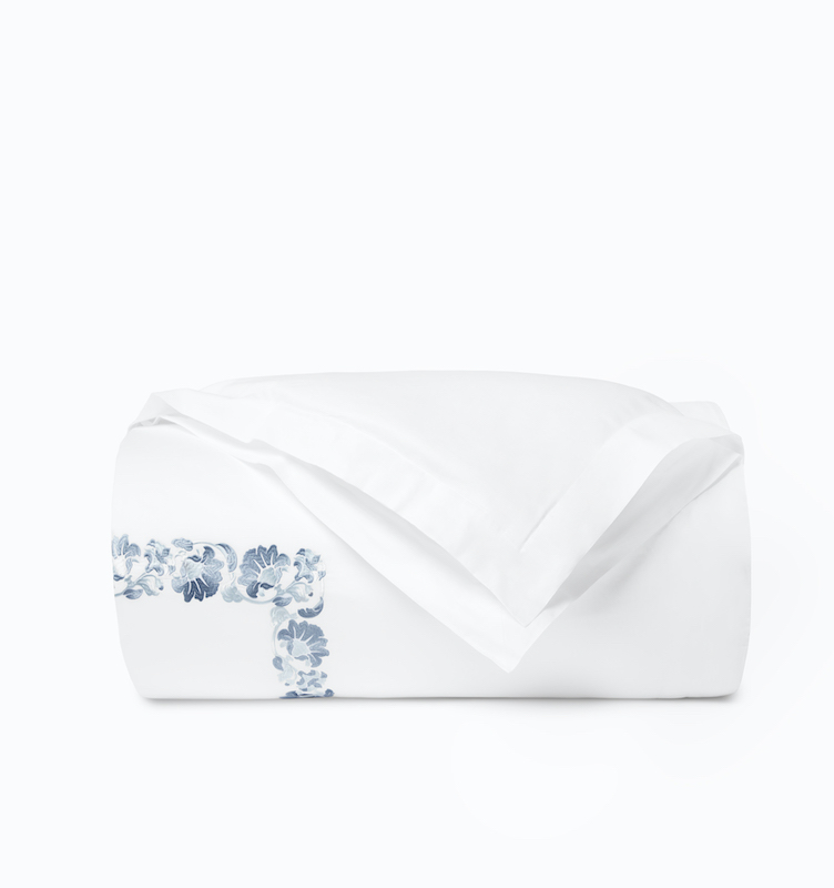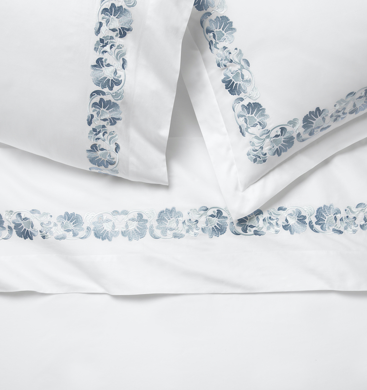 Fabrication: Sateen with elaborate embroidery: Duvet Cover: U Shape on top of bed; Shams: 4 sides; Flat Sheet and Pillowcases: Along return and cuff.