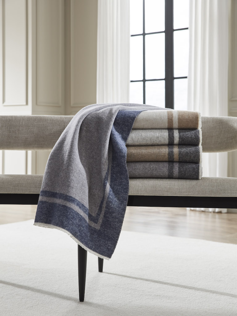 Sferra's Viletta Throw exudes softness and luxury. Viletta has a contrasting border frame and delicate fringe. The two way color palette is minimalist and refined, which makes it a perfect companion to any interior. Country of Origin: Italy.