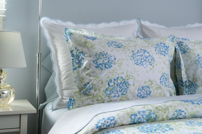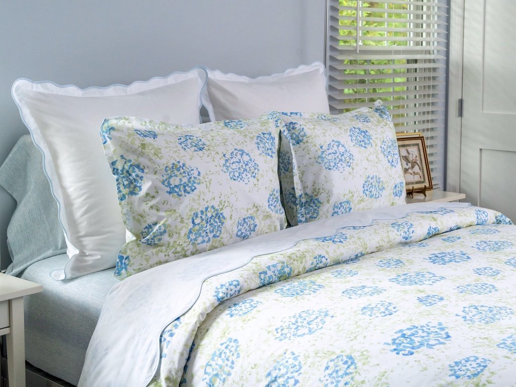 Stamattina's Abby is a contemporary Hydrangea print in blue and green on a white background. Shams have a 1” flange. The duvet covers are self reversing. Plain hem.