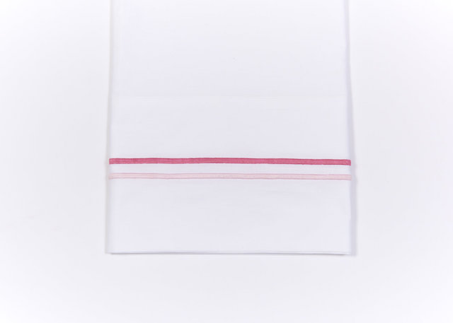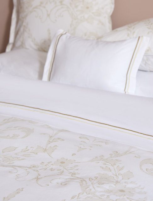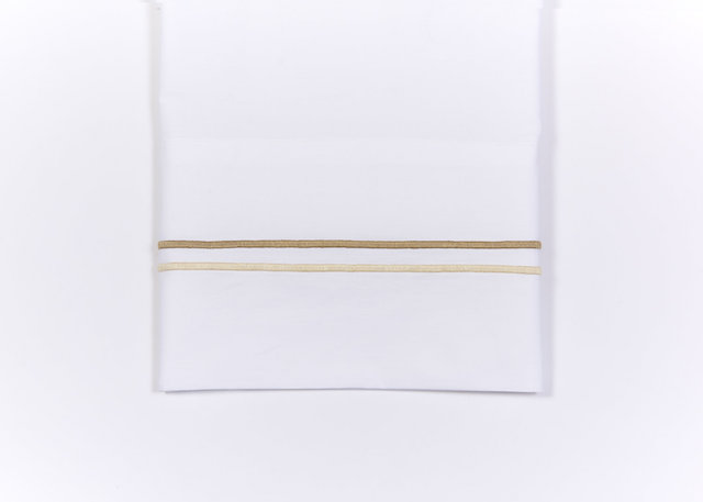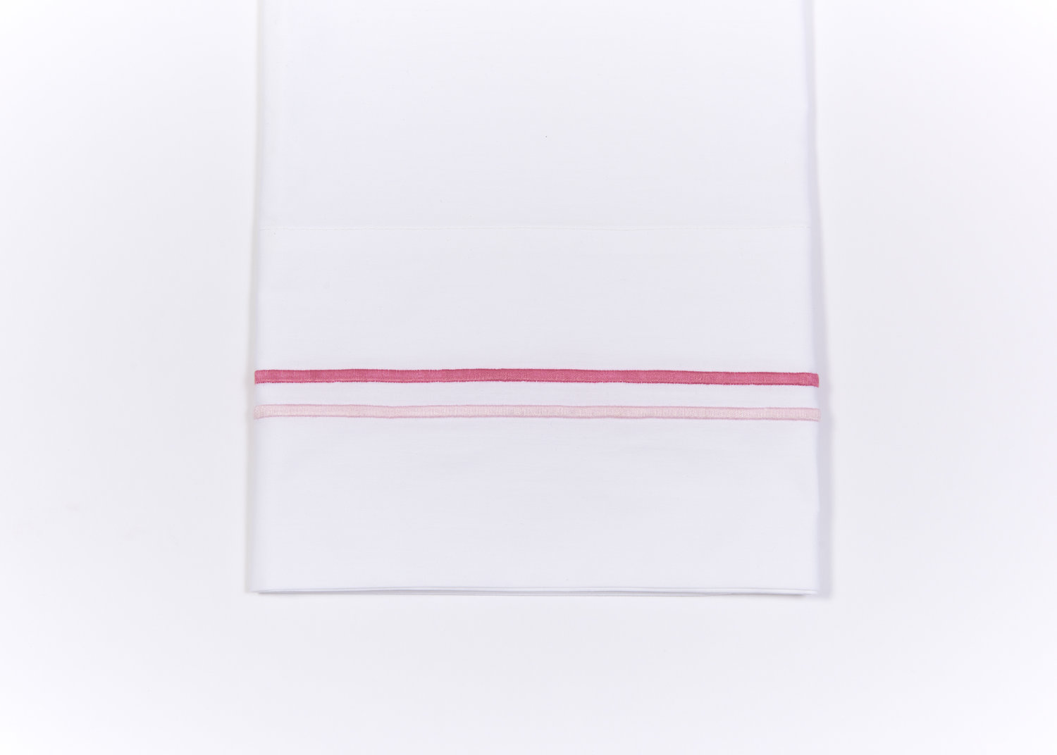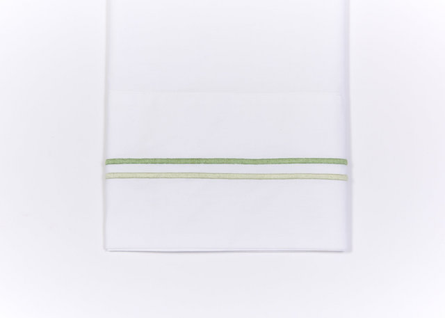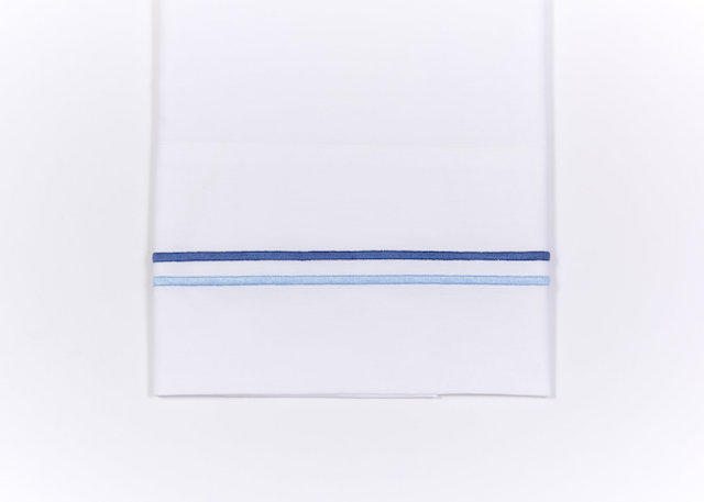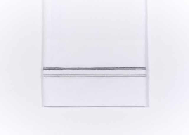 Arianna is just lovely. A white Italian Percale sheet with 2 shades of embroidery to give it a clean look. Available in two tones of six colors: Natural, Grey, Blue, Green, and Pink. Constructed and embroidered in USA. Duvets are constructed with two vertical lines of embroidery (head to foot). Shams are constructed with side flanges only (as pictured).