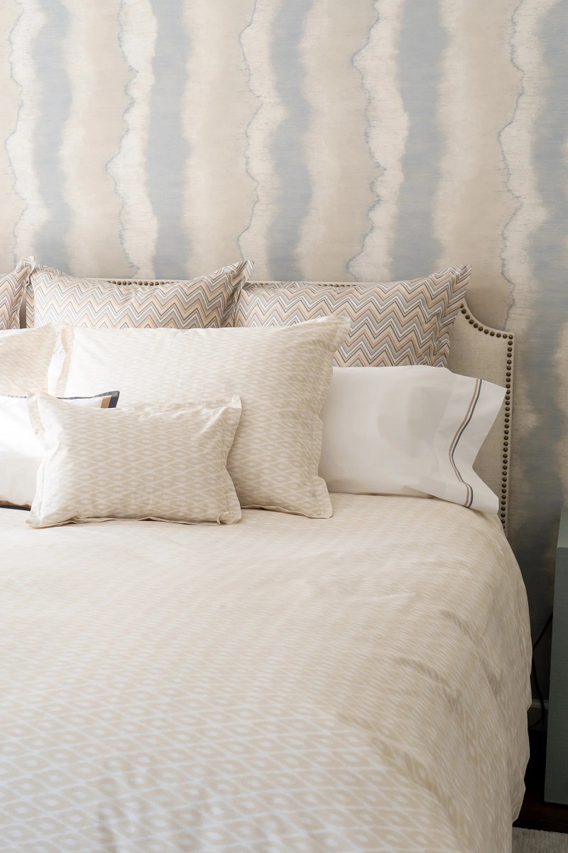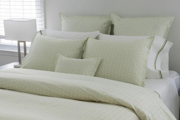 Stamattina's Carlo has a muted, soft, and small geometric pattern. It plays well with so many other Stamattina patterns. Shams have a 1” flange. The duvet covers are self reversing. Plain hem. Printed and finished in Spain and constructed in USA.