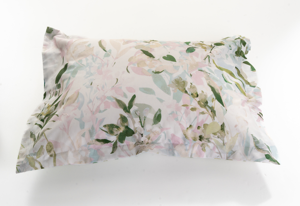 Stamattina's Jill is a sweet watercolor floral in soft hues on a crisp white background. Shams have a 1” flange. The duvet covers are self reversing. Plain hem finish. Printed and finished in Italy. Constructed in USA.