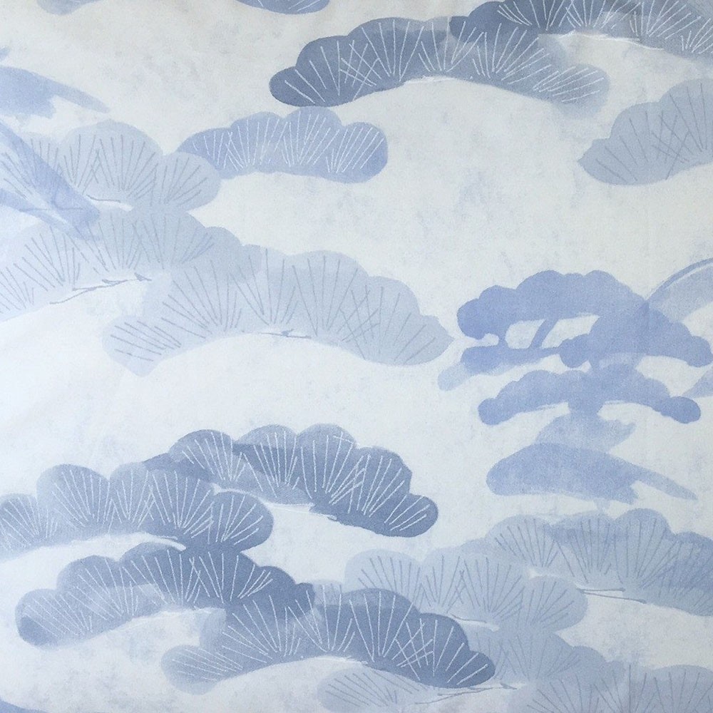 Stamattina's Kyoto evokes beautiful Japanese wood blocks. Blocks that print a sky full of soft, puffy clouds and a landscape of gentle trees and cloudy mountains all in a soothing shade of blue on white ground. The look is a true Asian masterpiece.