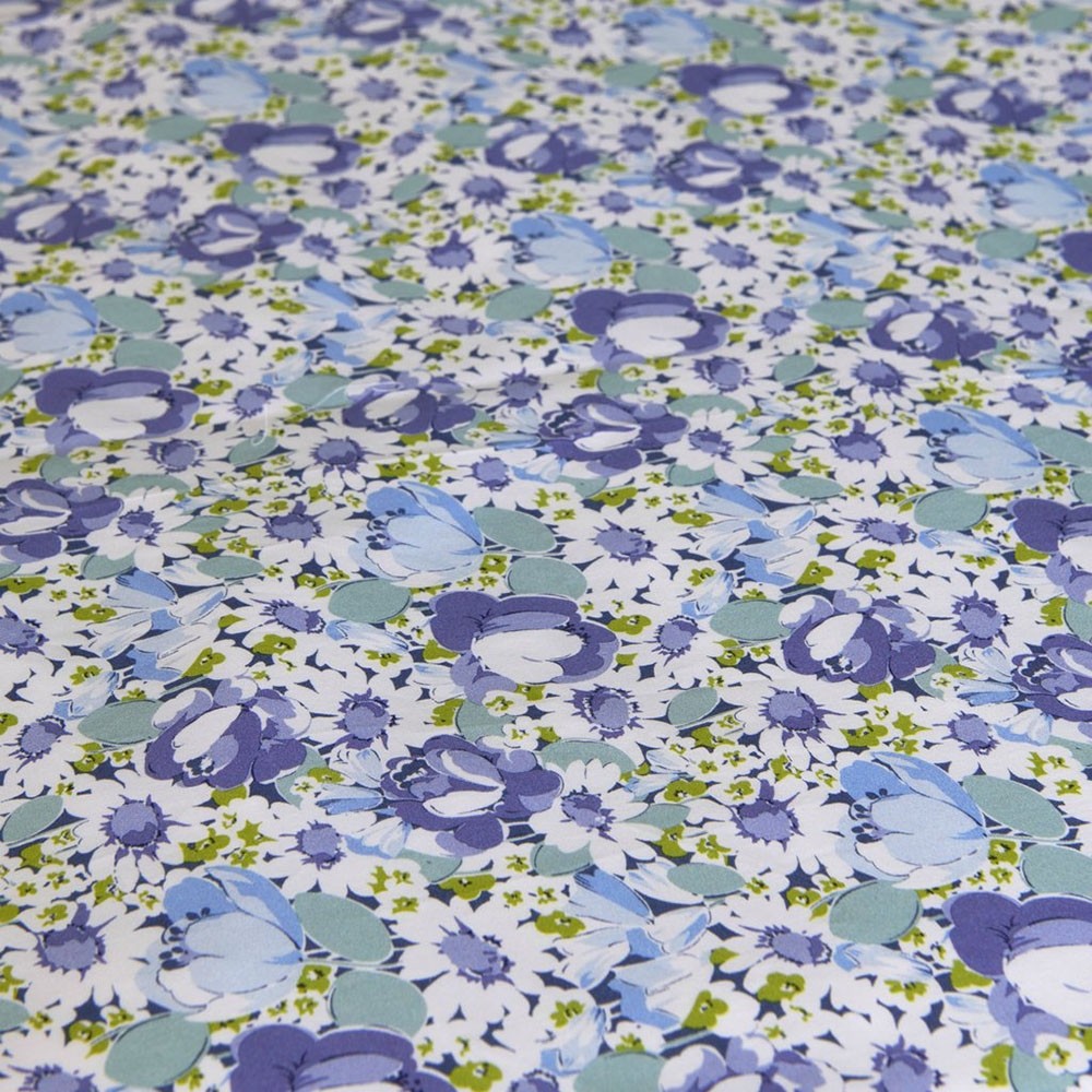 is sweet and lively. Small scattered tulips and daisies in whites, blues and lavender with a pop of green make this shower curtain fresh and abloom.